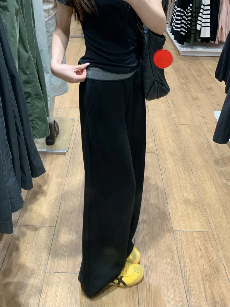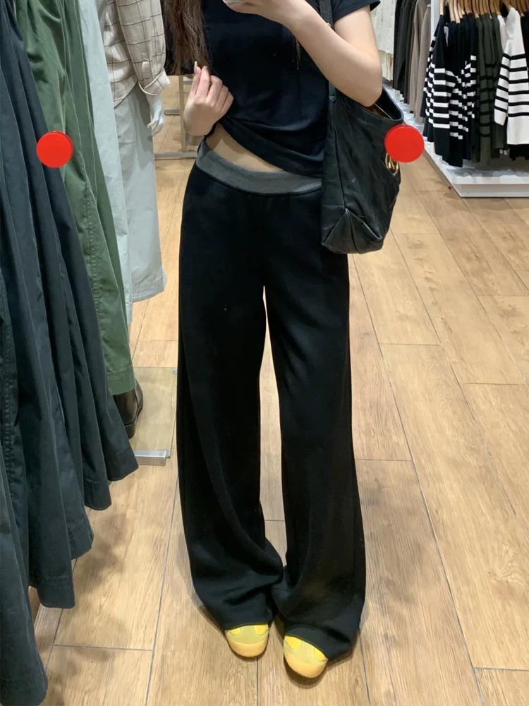 Quần thể thao nữ phối màu đen, kiểu mới xuân 2025, size lớn, cạp cao, tôn dáng, ống rộng, dài chấm đất.