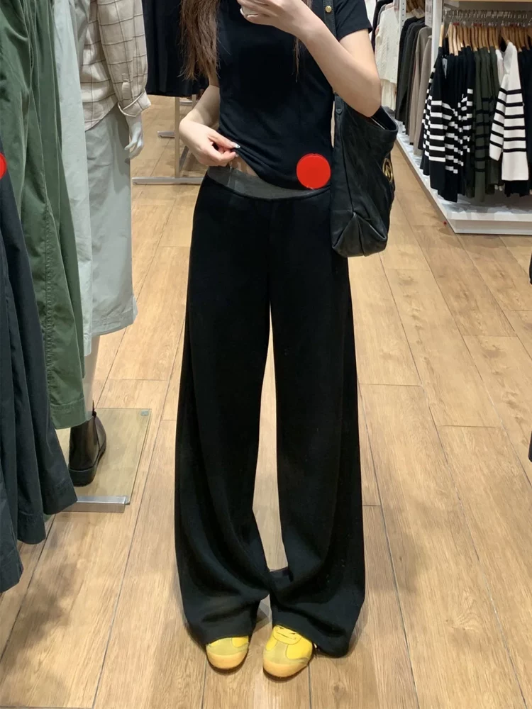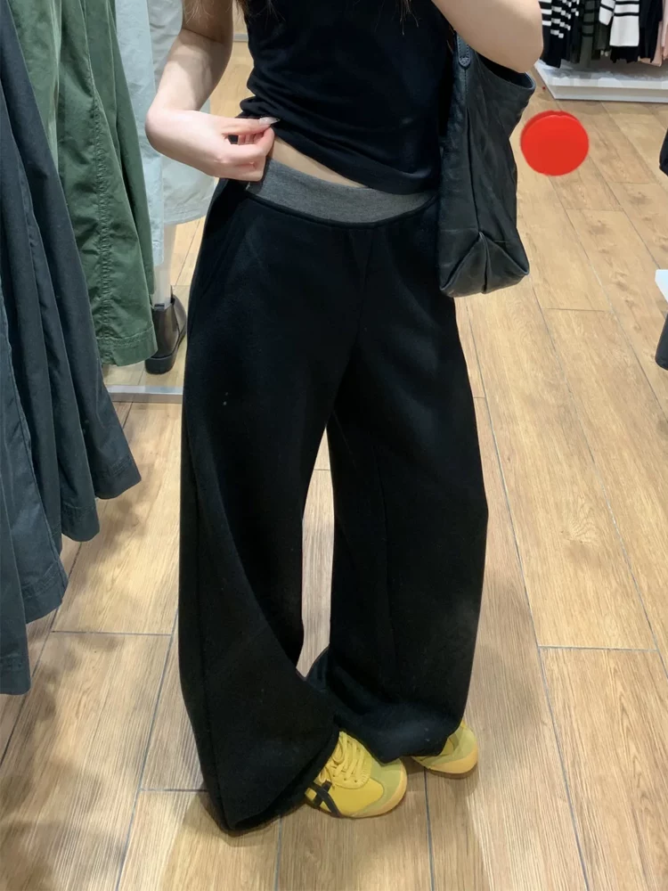 - Quần thể thao nữ phối màu đen, kiểu mới xuân 2025, size lớn, cạp cao, tôn dáng, ống rộng, dài chấm đất.