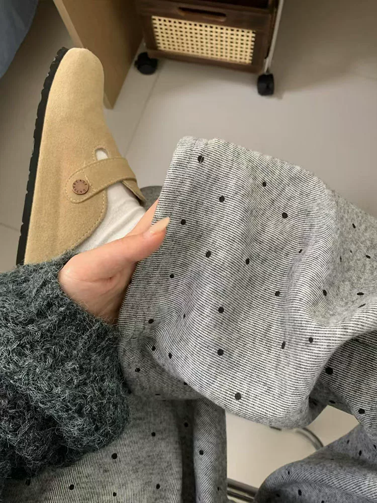 Quần thường ngày chấm bi màu xám dành cho nữ, phong cách đầu thu, cỡ lớn, lưng cao, dáng suôn, quần ống rộng mềm mại và thoải mái.