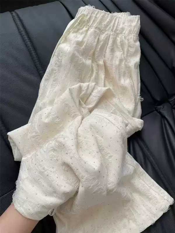 Quần thường ngày đính đá cho nữ, kiểu dáng mỏng mùa hè, cỡ lớn, lưng cao, dáng suôn, thon gọn, dáng quả lê, quần dài ống rộng thẳng