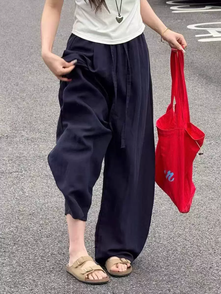 - Quần vải lanh lụa băng dành cho nữ, kiểu dáng mỏng mùa hè, cỡ lớn, lưng cao, mềm mại, rộng rãi, tôn dáng, quần cotton-lanh dáng cong.