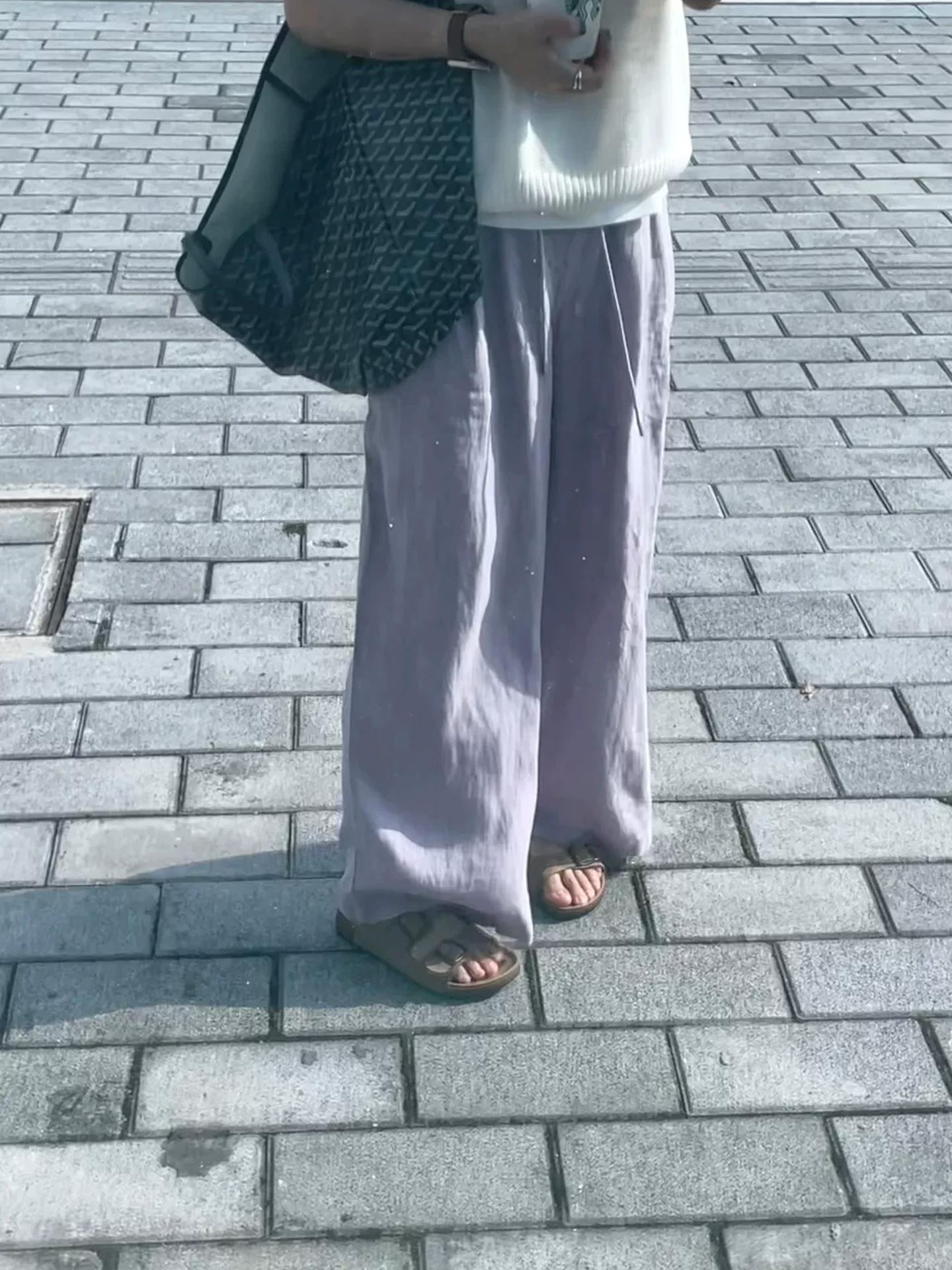 Quần vải lanh màu hồng tím dành cho nữ, kiểu mới hè 2025, size lớn, cạp cao, chất liệu mềm mại, tôn dáng, quần ống rộng chất liệu lụa đá.
