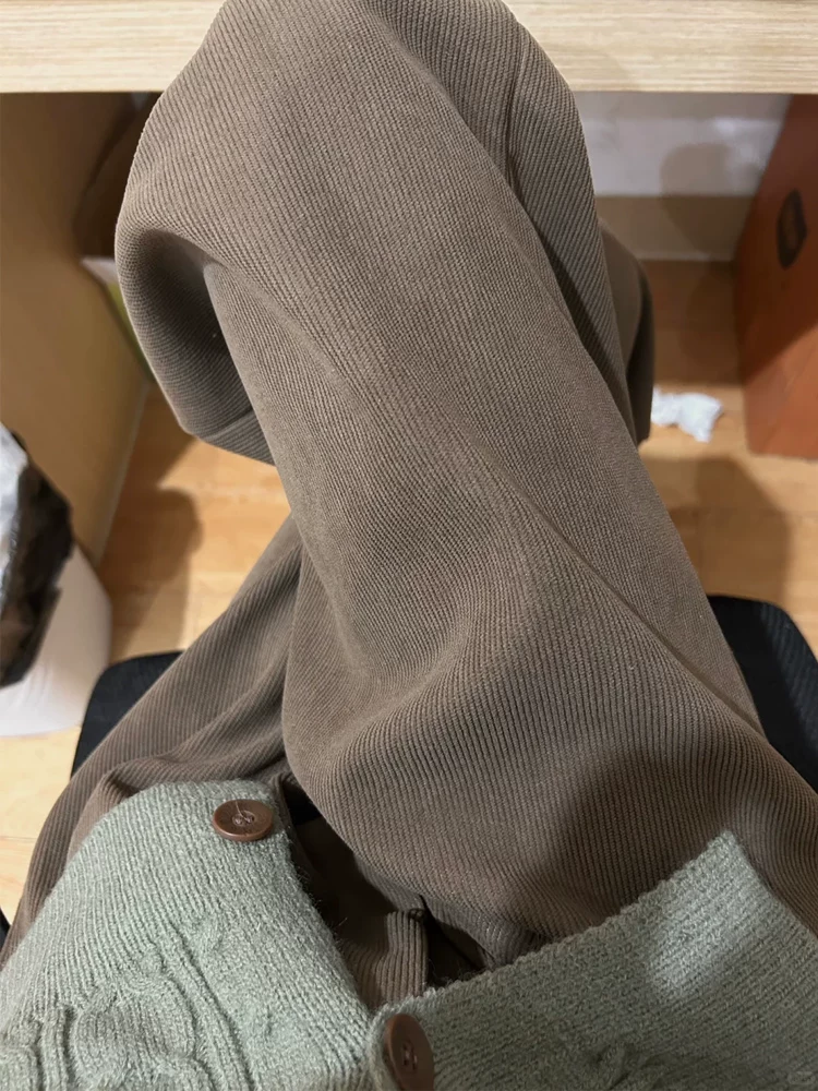 Quần vải nhung màu nâu dành cho nữ, mùa thu đông, cỡ lớn, lót lông cừu, dày dặn, lưng cao, mềm mại, rộng rãi, tôn dáng, quần ống rộng.