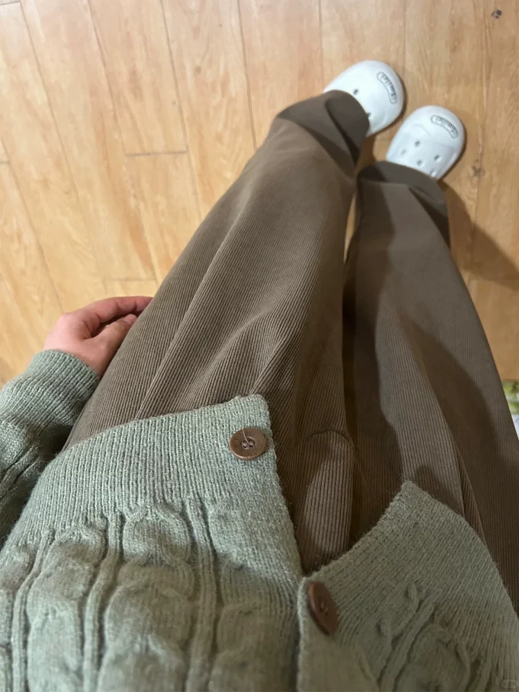 - Quần vải nhung màu nâu dành cho nữ, mùa thu đông, cỡ lớn, lót lông cừu, dày dặn, lưng cao, mềm mại, rộng rãi, tôn dáng, quần ống rộng.