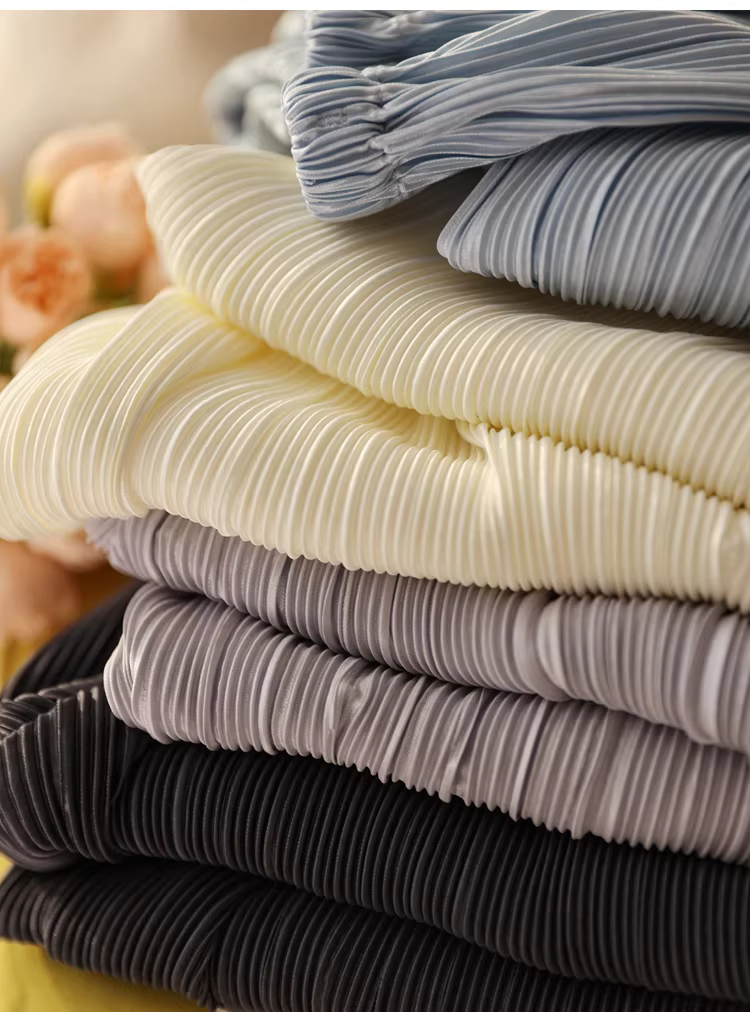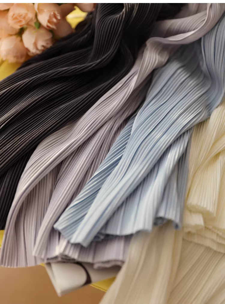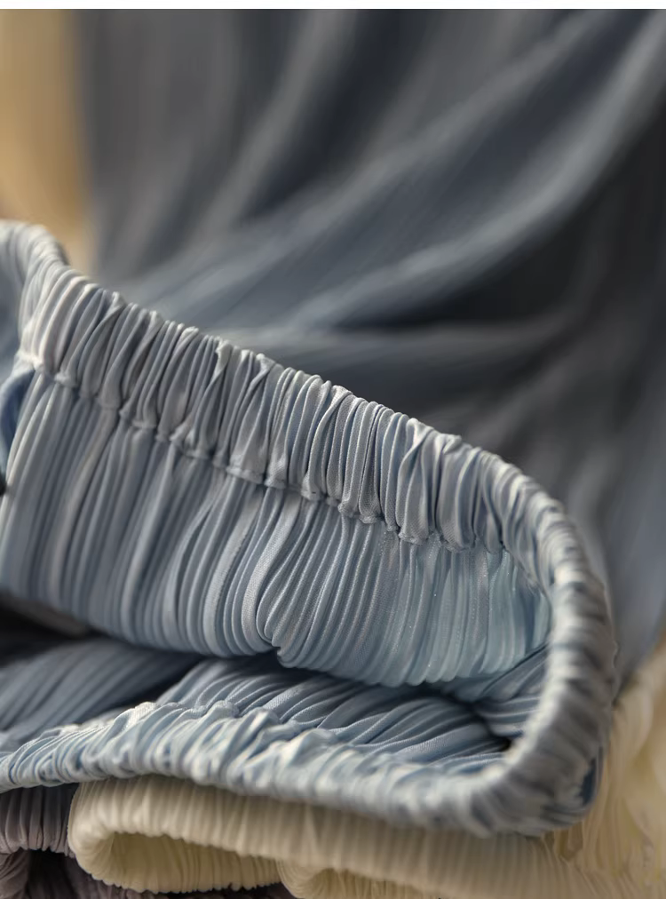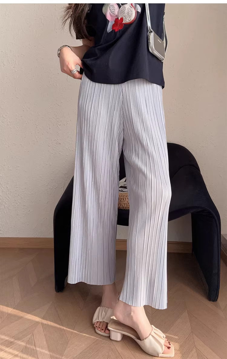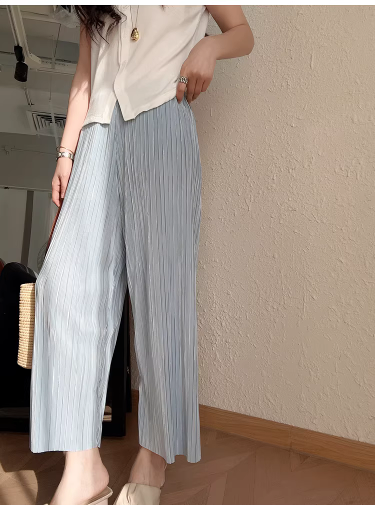 - Quần xếp ly kiểu Miyake, vải xếp ly lụa bóng một mảnh, quần ống rộng cạp cao dáng thẳng tôn dáng cho nữ, mới cho mùa hè