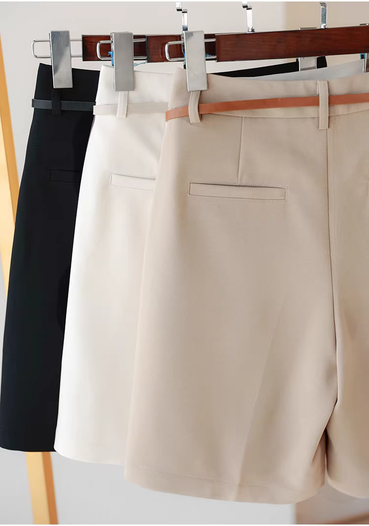 Rất khuyến khích! Thiết kế sạch sẽ và tôn dáng! Quần short kiểu dáng chữ A, cạp cao, đường may giữa, dành cho nữ, có kèm thắt lưng.