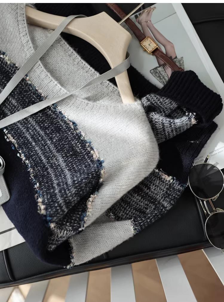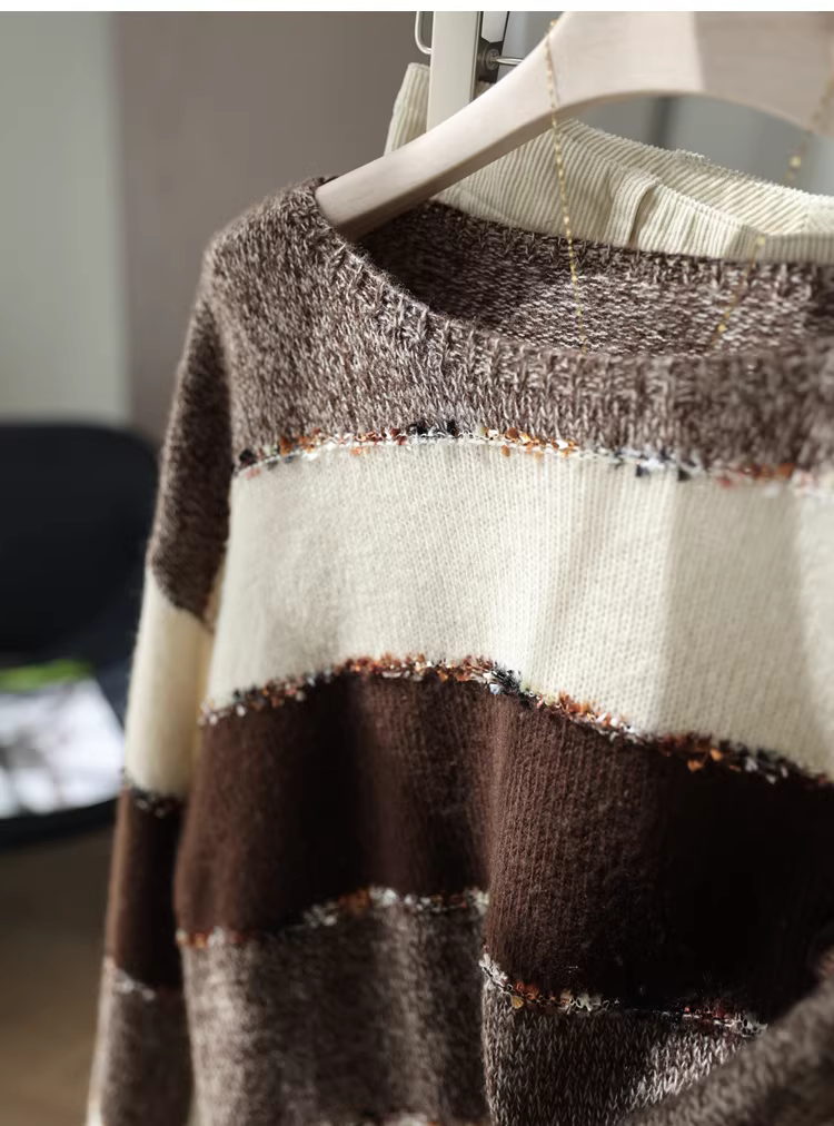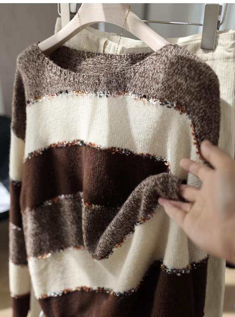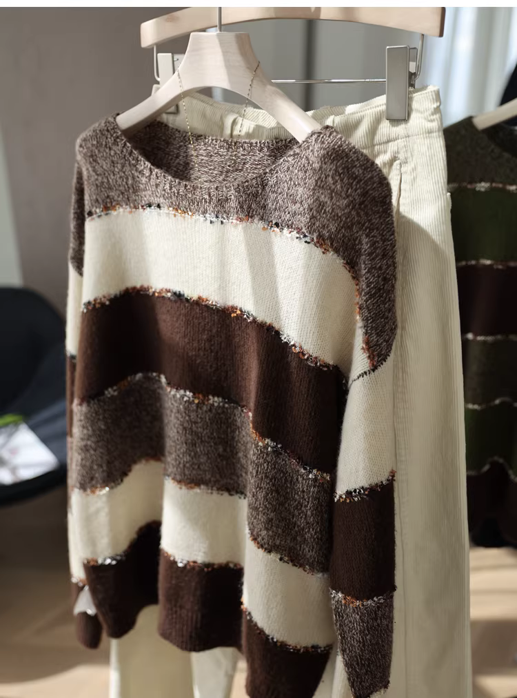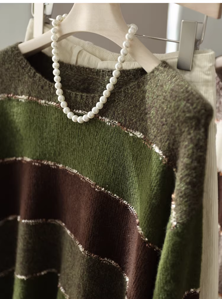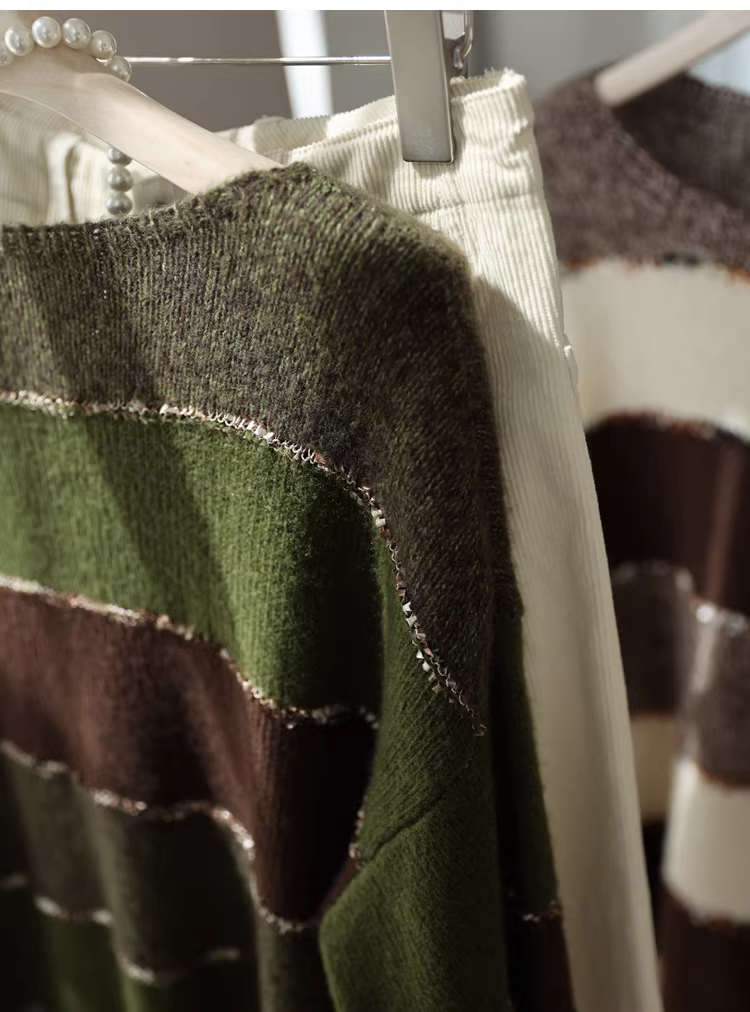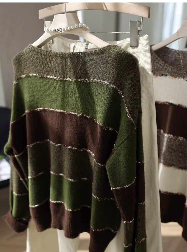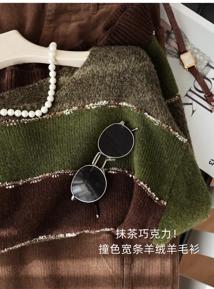 Sôcôla matcha! Áo len len cashmere lười biếng có sọc tương phản, áo len dệt sợi đặc biệt dành cho nữ, mới cho mùa thu.