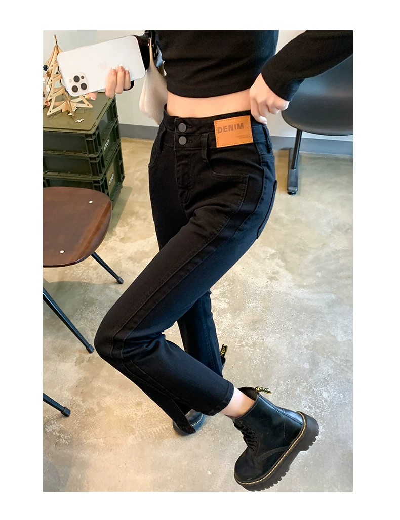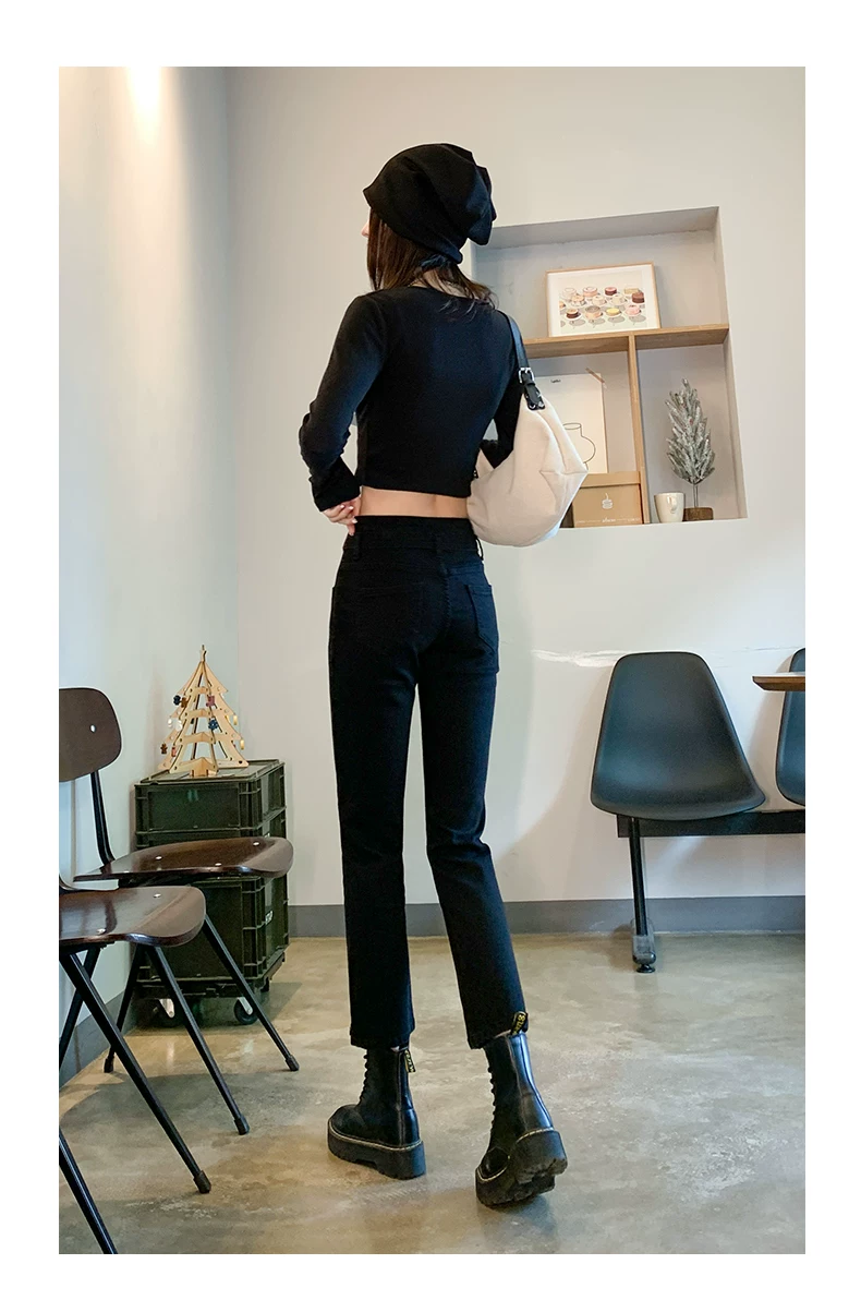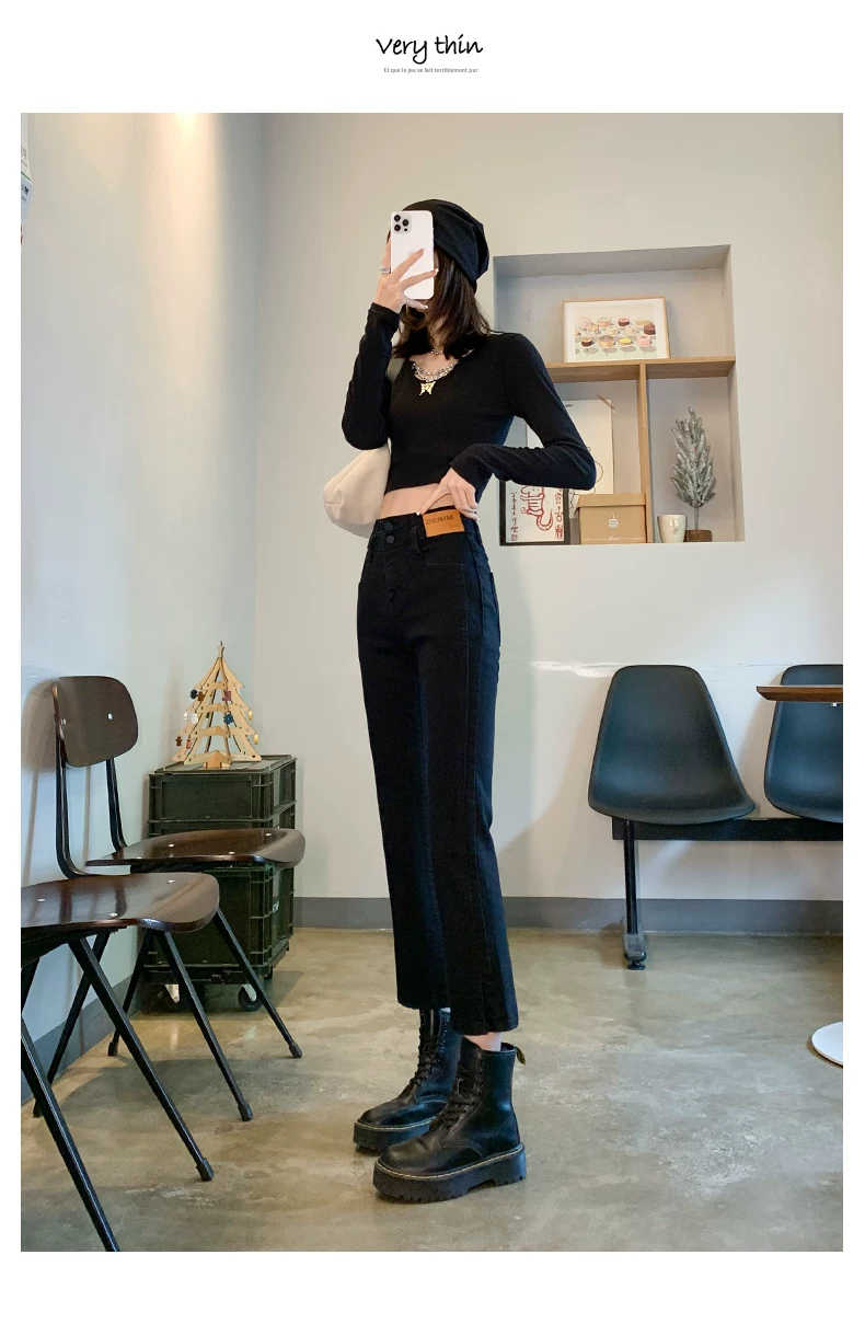 Thân hình quả lê, hơi mũm mĩm, trang phục mùa thu sớm dáng thẳng, quần jean cạp cao, che hông, tôn dáng, co giãn, xẻ tà.