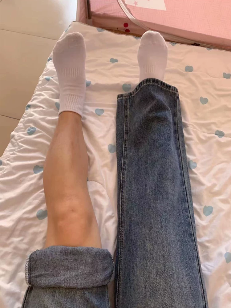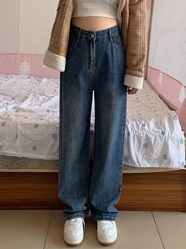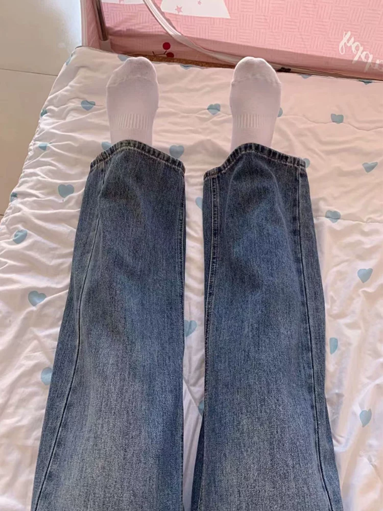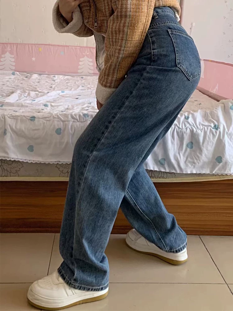 - Thân hình quả lê, hông và đùi dày, quần jean ống thẳng cho nữ, phong cách đầu thu, cỡ lớn, lưng cao, rộng rãi, giảm béo, quần ống rộng
