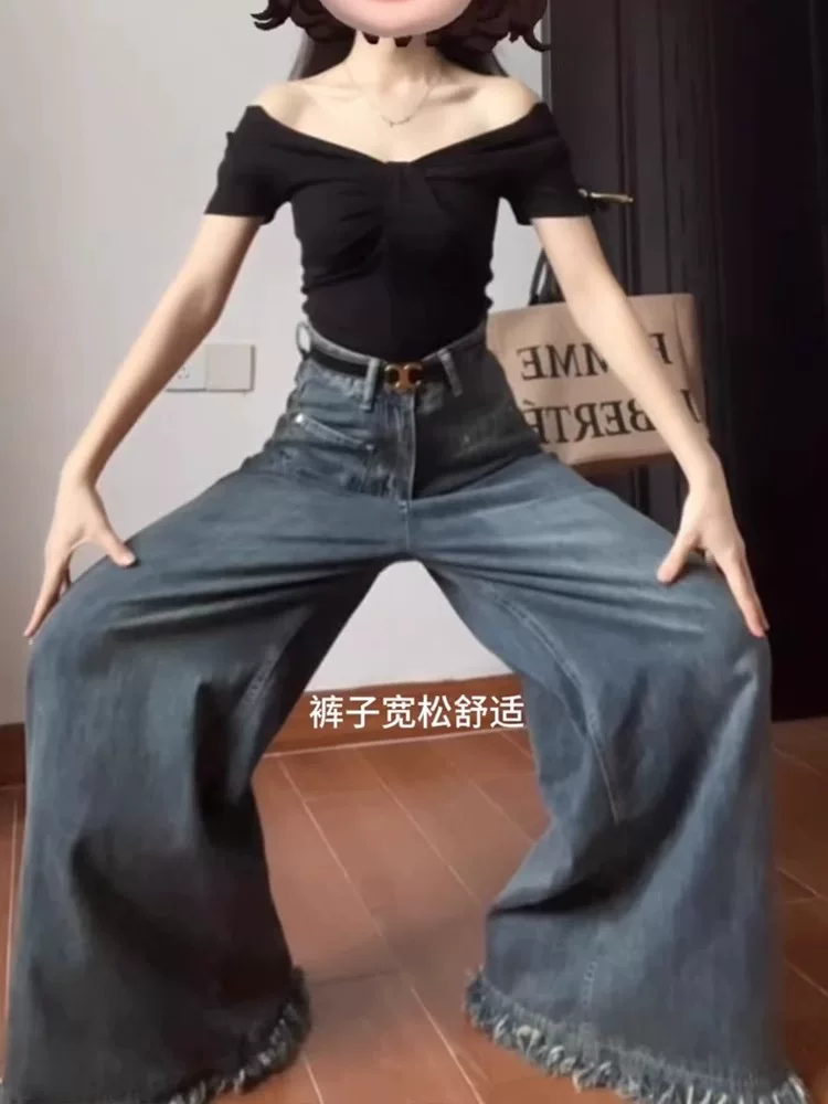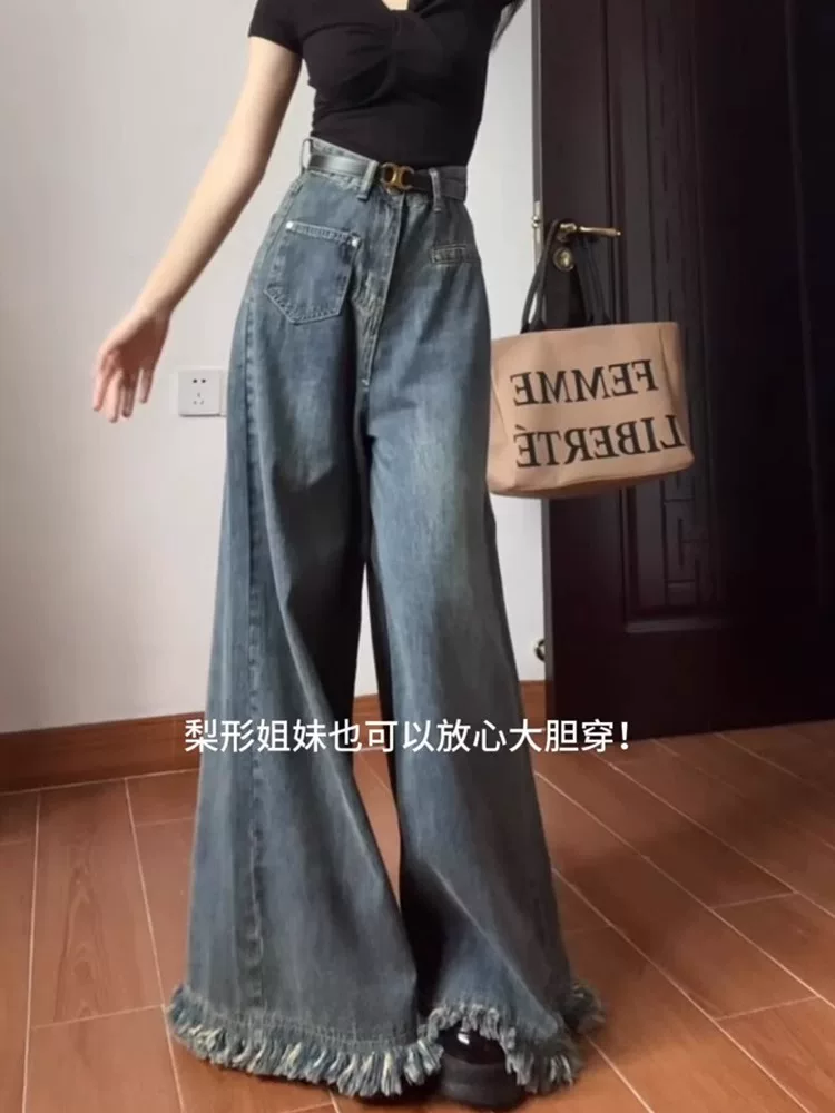 - Thân hình quả lê, quần jean ống rộng kiểu dáng lười biếng dành cho nữ, cỡ lớn mùa thu, lưng cao, dáng rộng, thon gọn, ống thẳng, quần dài chạm sàn