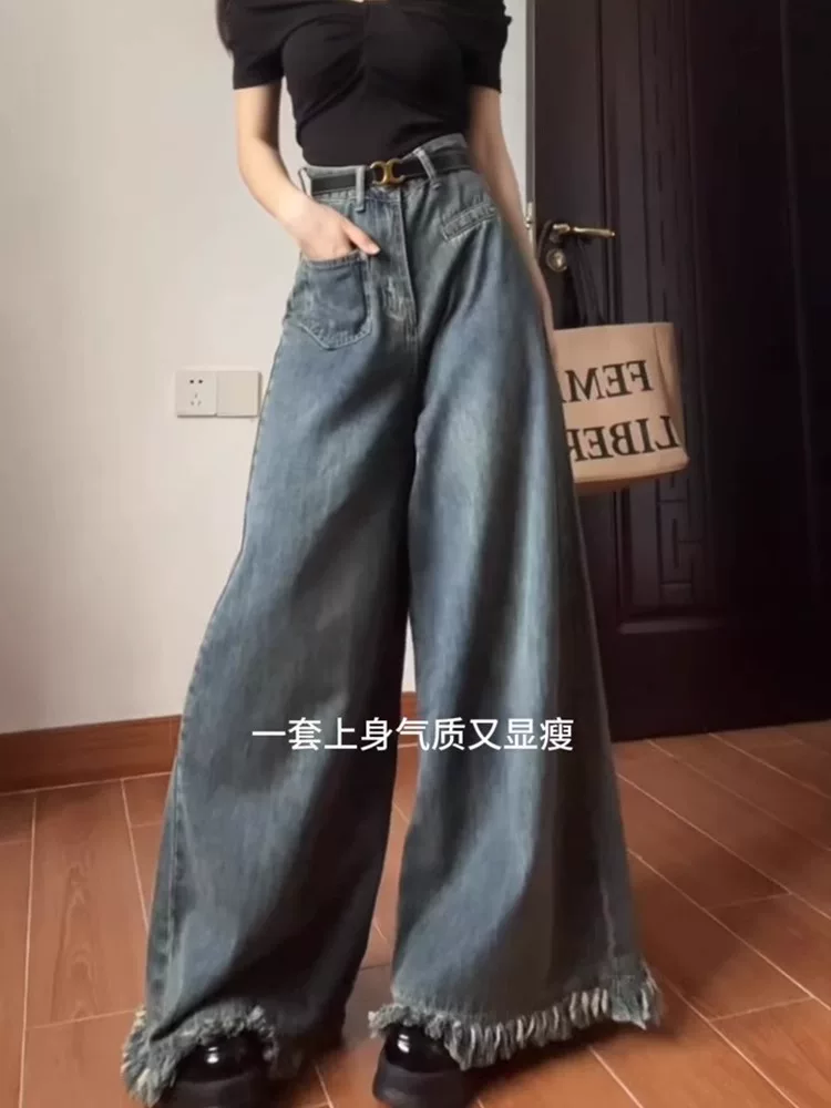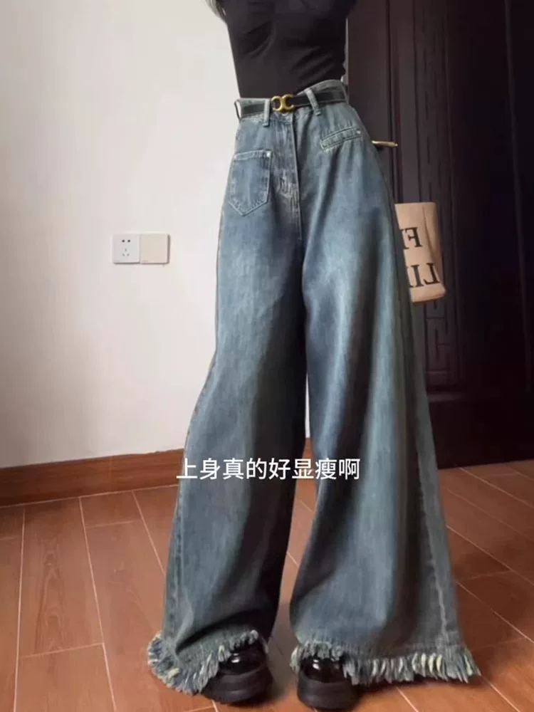Thân hình quả lê, quần jean ống rộng kiểu dáng lười biếng dành cho nữ, cỡ lớn mùa thu, lưng cao, dáng rộng, thon gọn, ống thẳng, quần dài chạm sàn