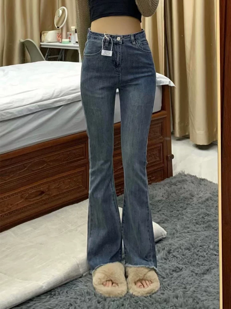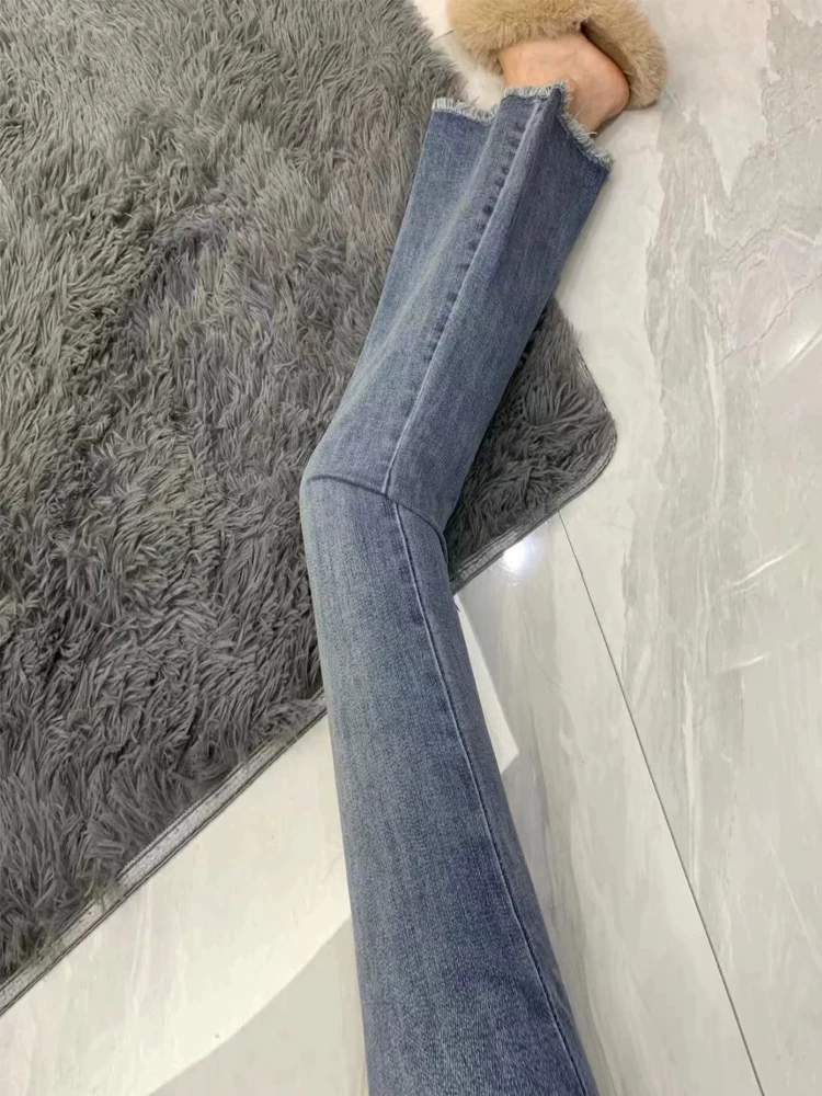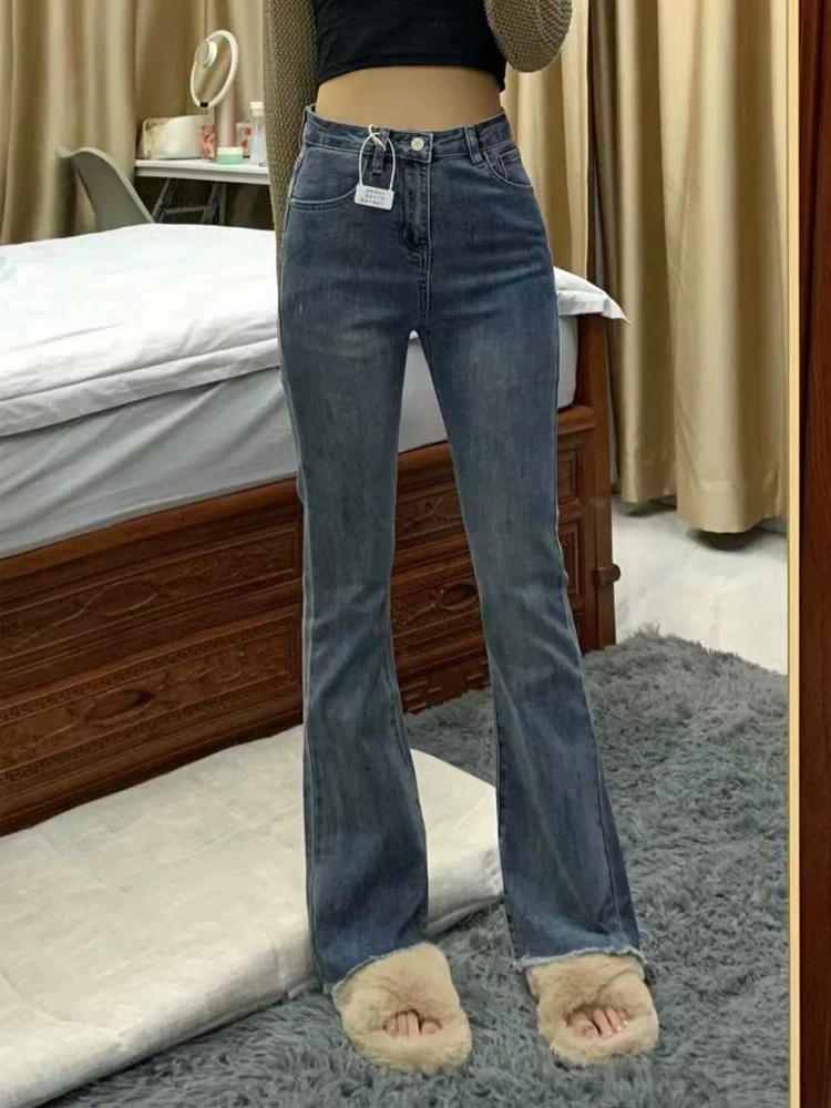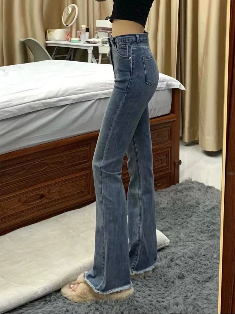 Thân hình quả lê, quần jean ống thẳng hơi loe dành cho nữ, trang phục cỡ lớn đầu thu, quần ống loe co giãn che hông, cạp cao, giúp giảm béo dành cho phụ nữ mũm mĩm.