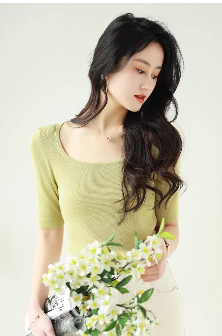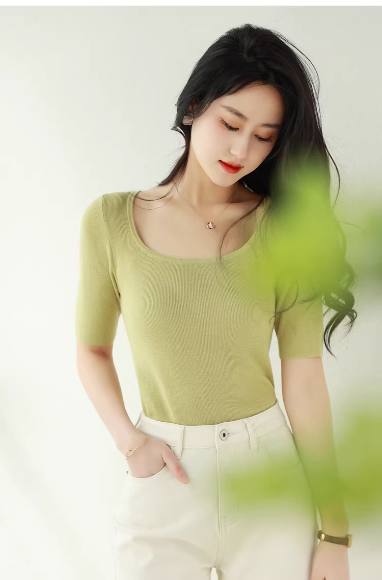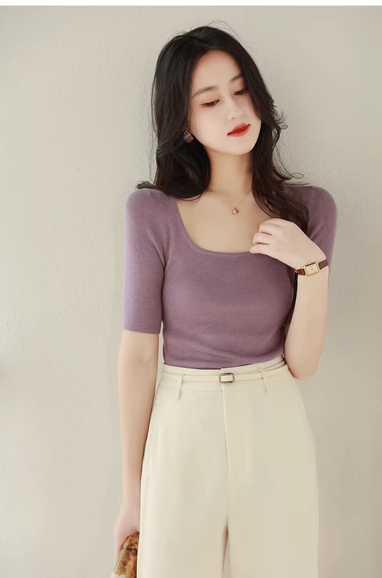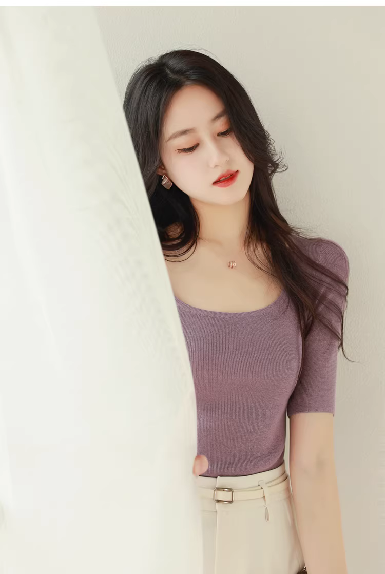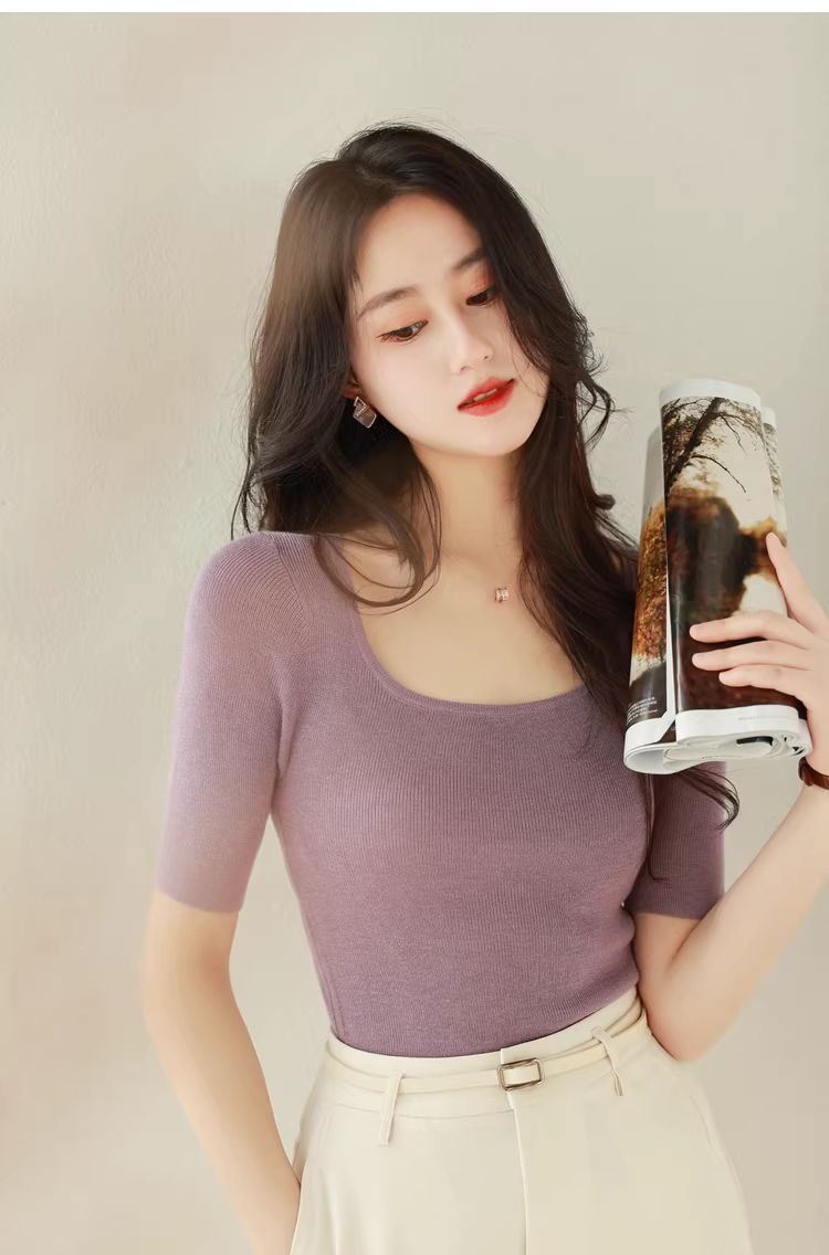 - Thanh lịch vừa vặn~ Áo dệt kim dáng ôm cổ vuông kiểu Pháp bằng len lụa dành cho nữ, mới dành cho mùa xuân hè.