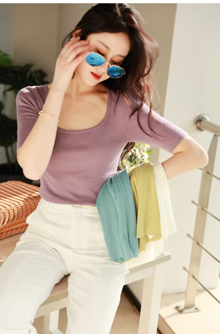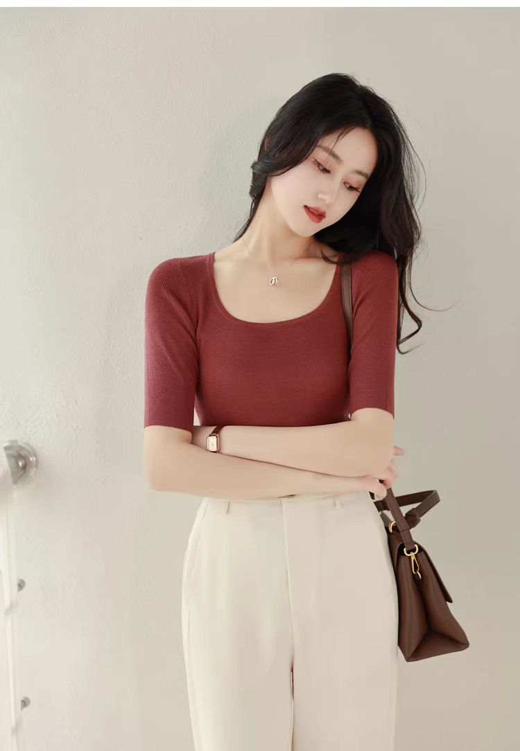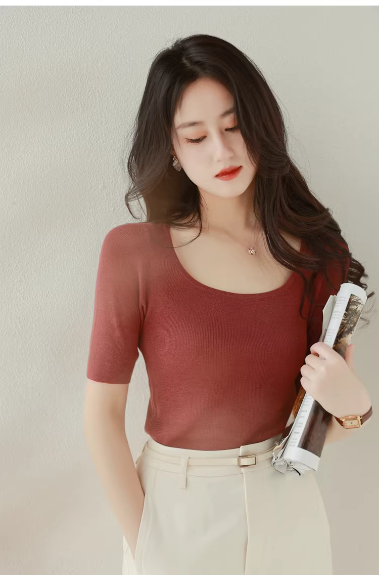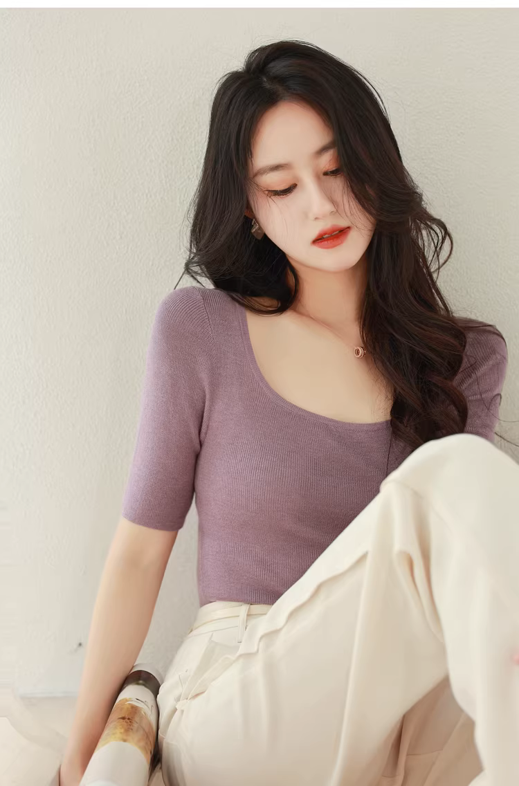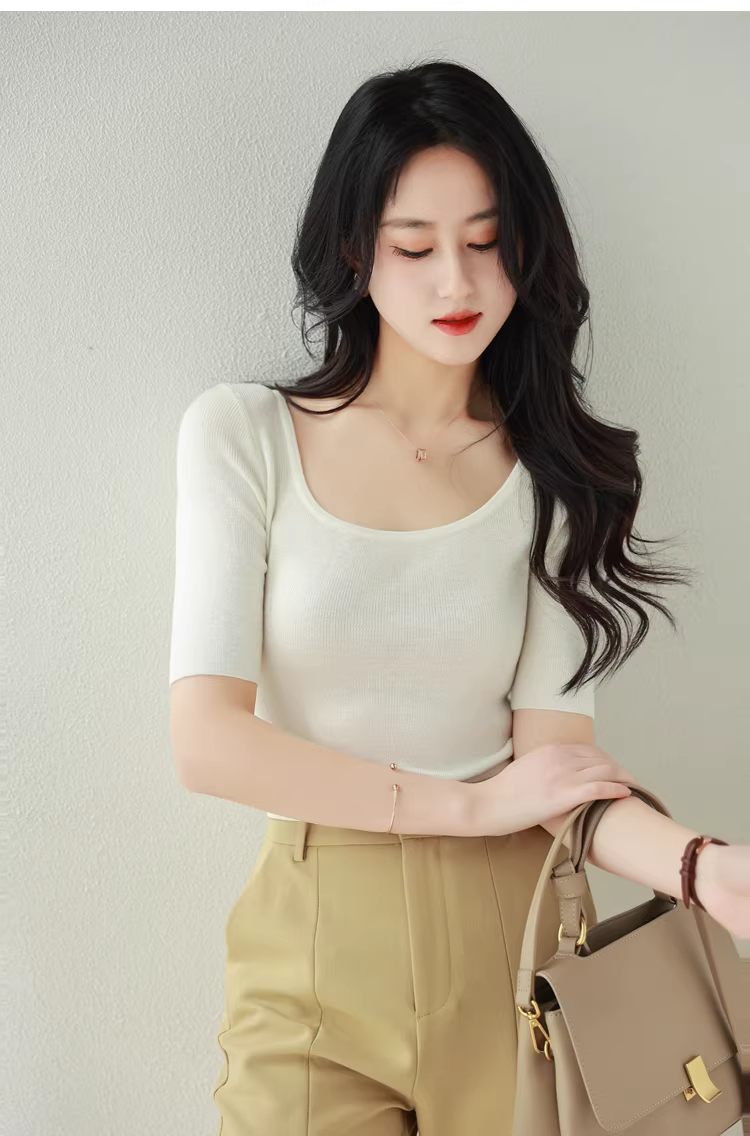 - Thanh lịch vừa vặn~ Áo dệt kim dáng ôm cổ vuông kiểu Pháp bằng len lụa dành cho nữ, mới dành cho mùa xuân hè.