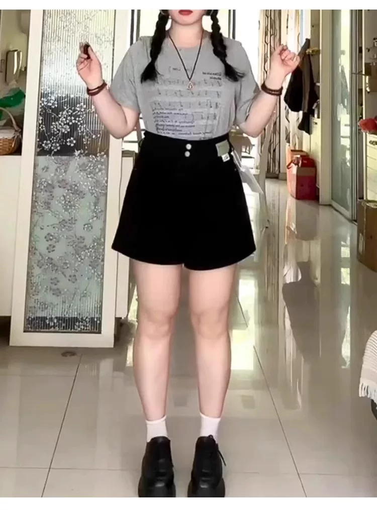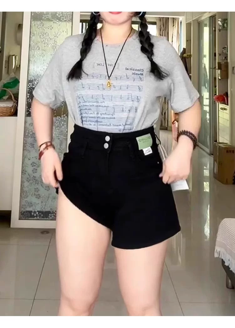 Thích hợp cho phụ nữ có hông và đùi dày, quần short denim cho mùa hè, cỡ lớn, cạp cao, co giãn, che bụng, giảm béo, quần ống rộng dáng chữ A.