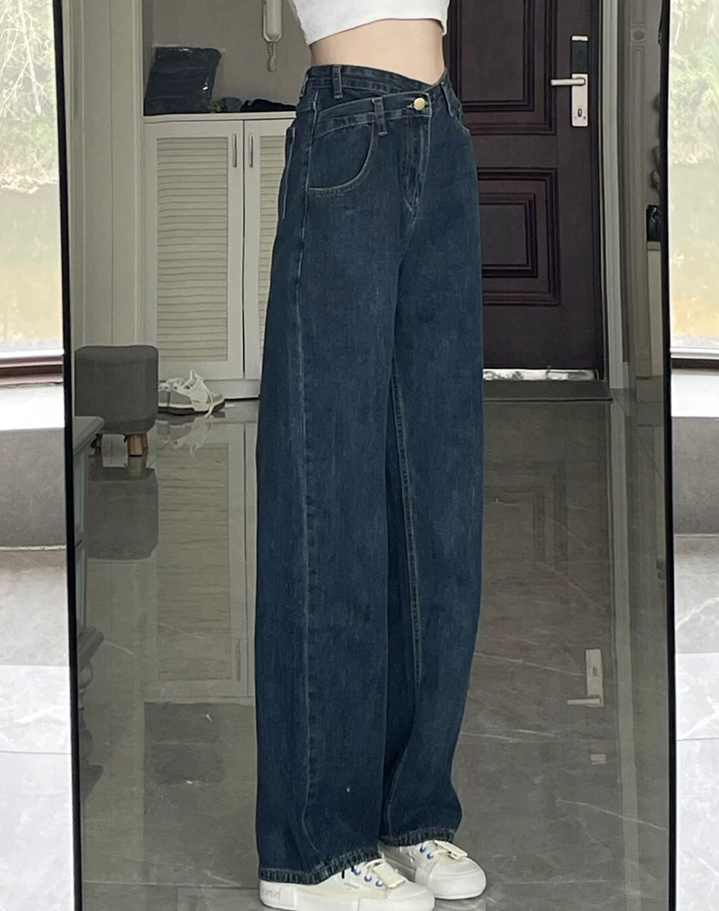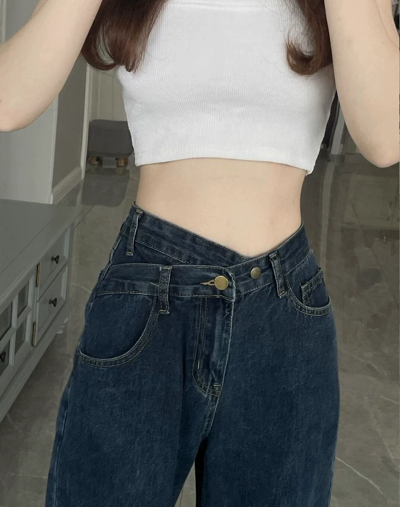 - Thiết kế dáng quả lê, quần jean ống thẳng không đều, phong cách mới đầu thu, hơi mũm mĩm mm, quần ống rộng cạp cao, tôn dáng