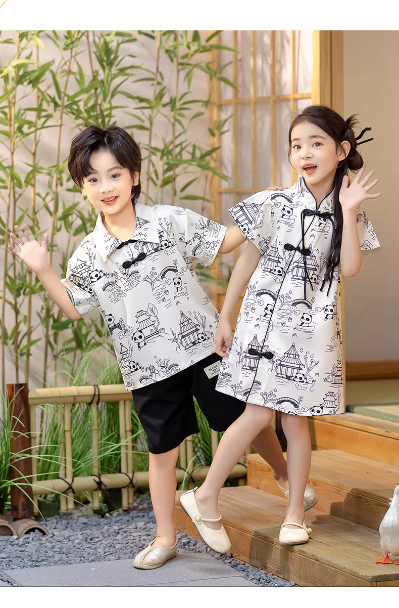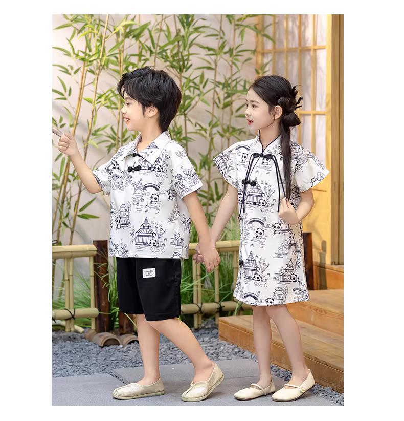 - Trang phục gấu trúc kiểu Trung Hoa dành cho bé trai, váy sườn xám dành cho bé gái, trang phục anh chị em Hanfu vẽ tranh mực, trang phục biểu diễn, quần áo mùa hè cho trẻ mới biết đi