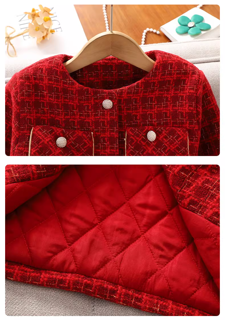 Trang phục phong cách Chanel cho bé gái mùa thu đông mới 2025 trang phục lễ hội dày dặn cho bé gái váy xếp ly màu đỏ dành cho trẻ em