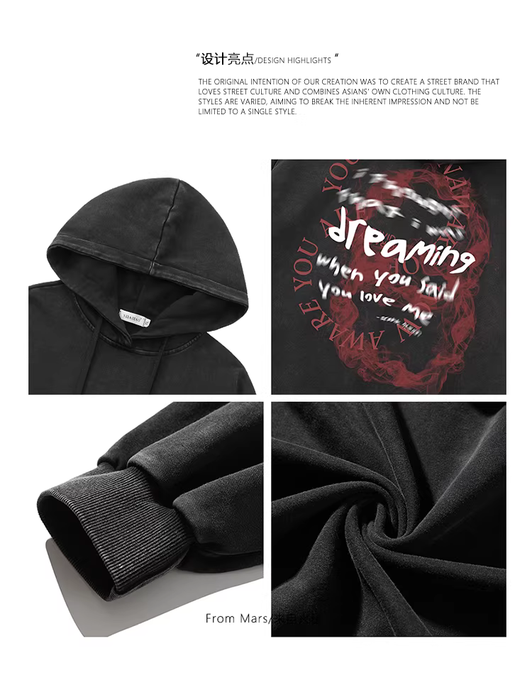 - Từ sao Hỏa Khói màu máu Phong cách tối màu hợp thời trang Áo hoodie in chữ mờ dáng rộng giản dị Ins