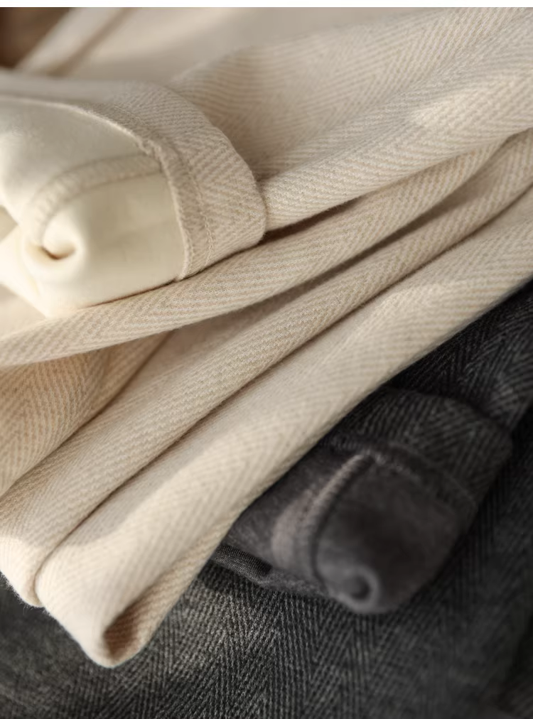 低调的人字纹肌理,在米杏的温柔、黑灰的沉稳中