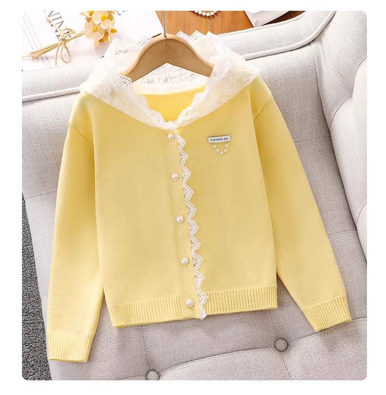 Váy áo len dệt kim có mũ trùm đầu ren cho bé gái, trang phục mùa xuân 2025, bộ hai mảnh gồm váy bánh ngọt công chúa bằng vải tuyn mới cho trẻ em