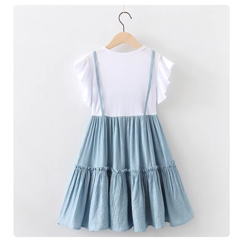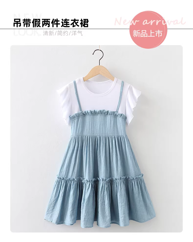 - Váy bé gái hè 2025 chất liệu cotton nguyên chất, kiểu dáng thời trang, váy công chúa cho bé lớn, kiểu hai mảnh giả, váy ngắn