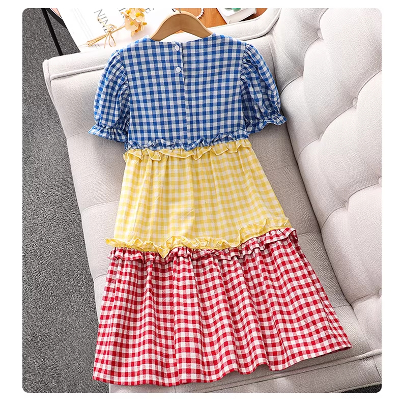 Váy bé gái hè 2025 kiểu mới, váy công chúa kẻ caro tay ngắn cho bé gái lớn, phong cách Hàn Quốc