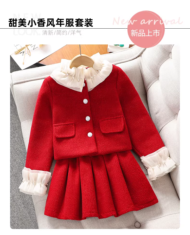 Váy bé gái thu đông 2025 kiểu mới phong cách Chanel nhỏ nhắn, đầm đỏ trẻ em, trang phục Tết, váy lễ hội