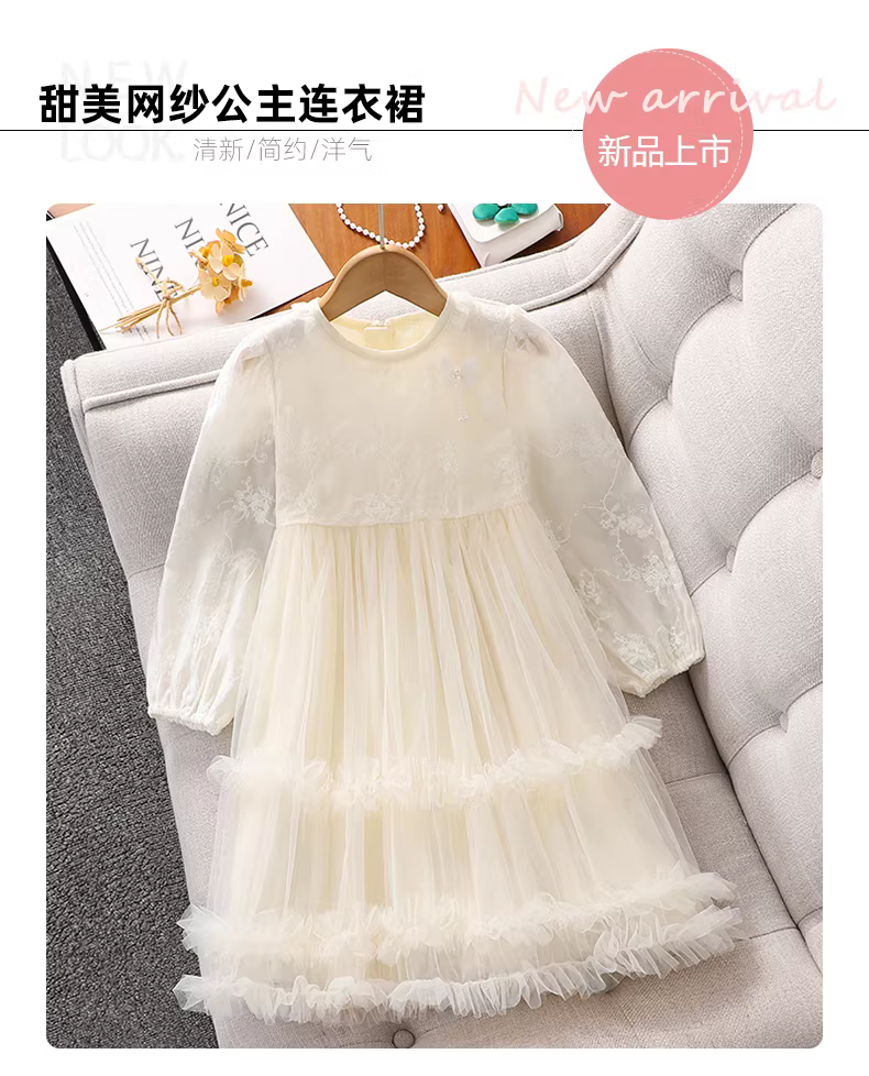 Váy bé gái xuân 2025 mẫu mới, váy công chúa lưới trẻ em, váy bánh bèo tay dài mùa xuân thu cho bé gái