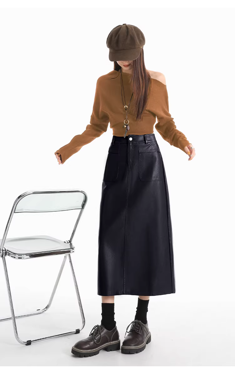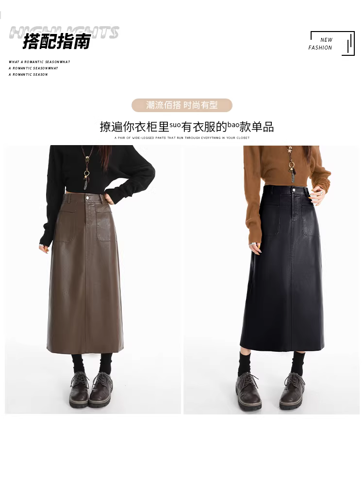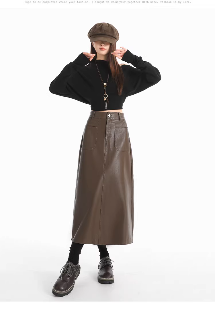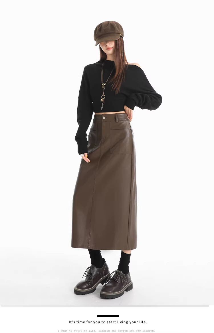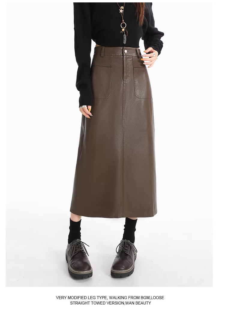 Váy bút chì màu cà phê La Chapelle dành cho nữ, kiểu mới thu đông 2025, váy da dáng dài vừa phải, eo cao, tôn dáng.