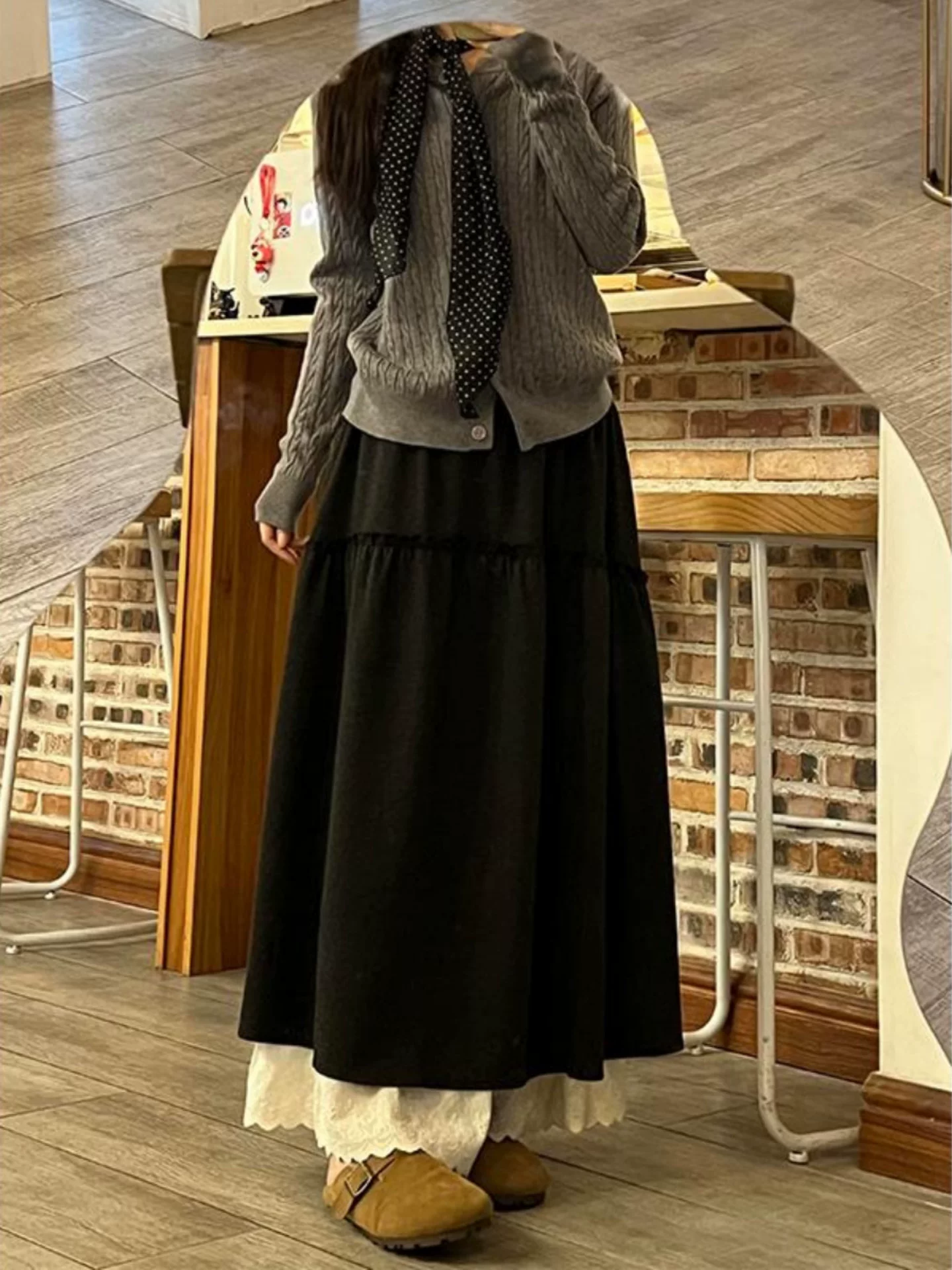 - Váy chắp vá viền ren màu đen dành cho nữ, mùa thu đông, cỡ lớn, lưng cao, thon gọn, váy dài xếp tầng chữ A xếp tầng.