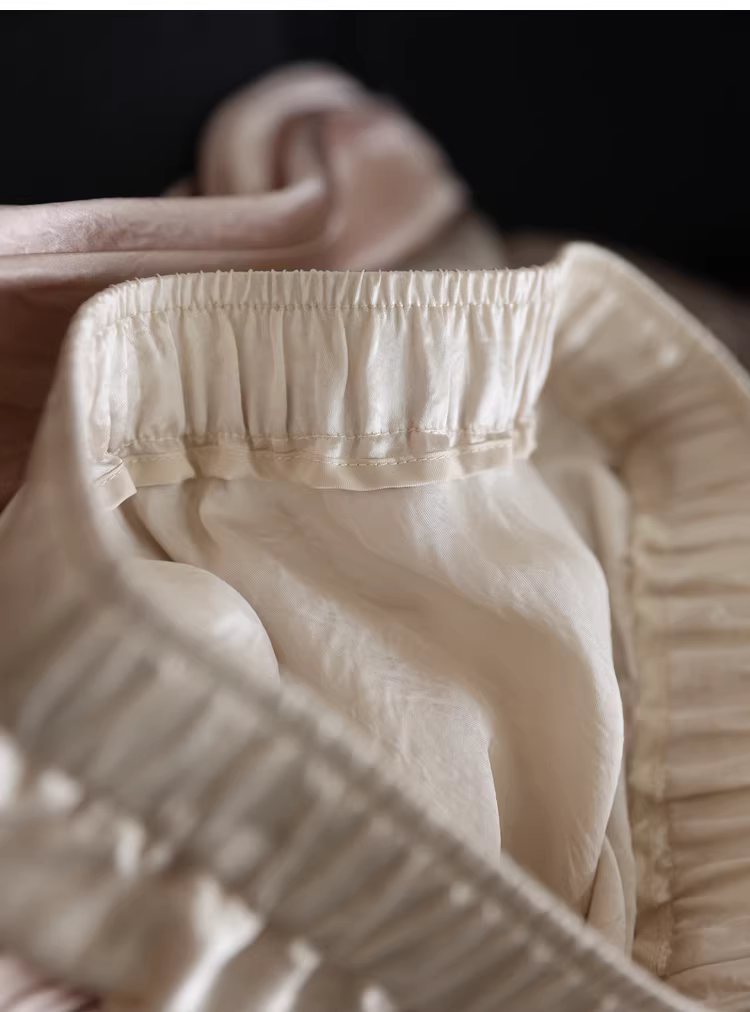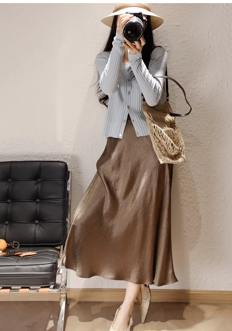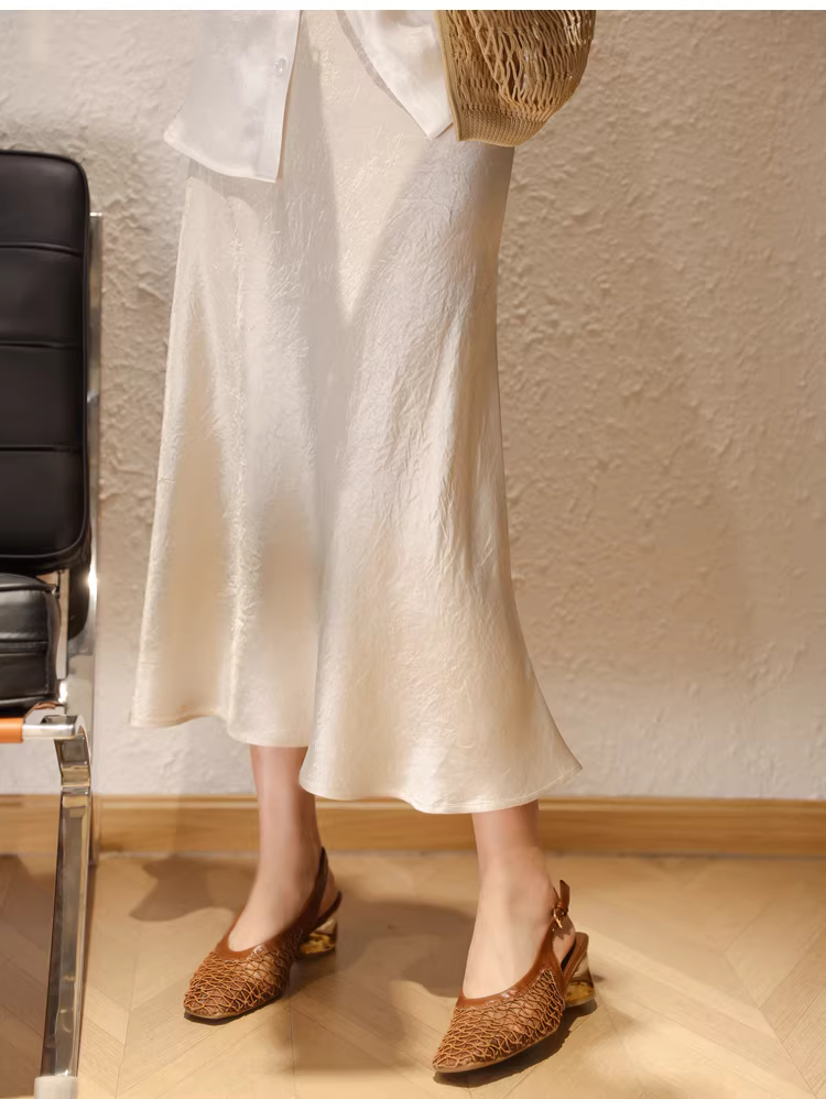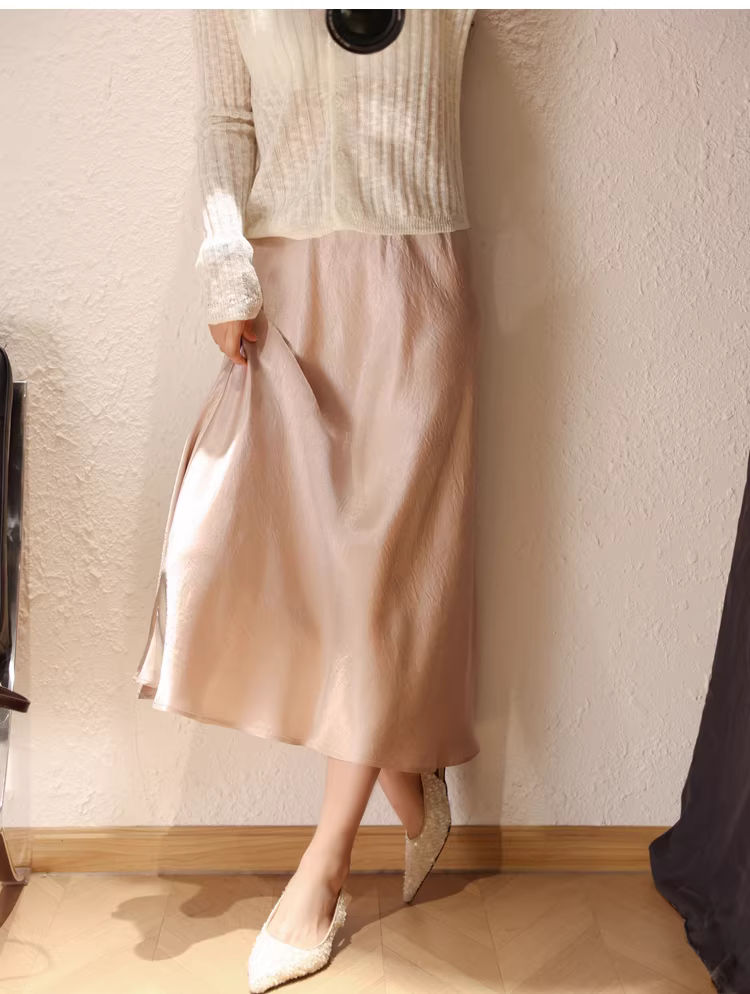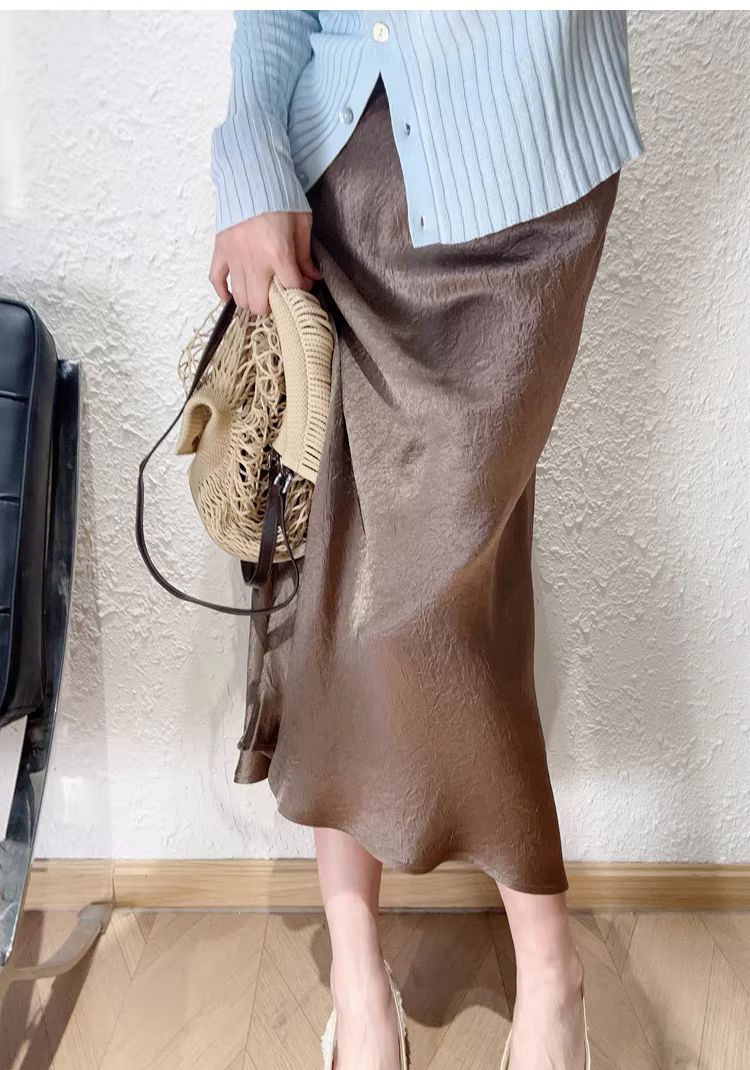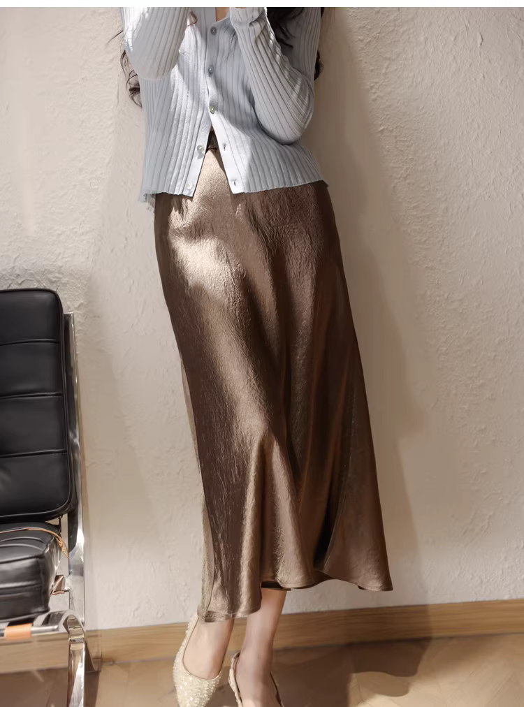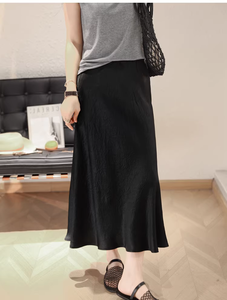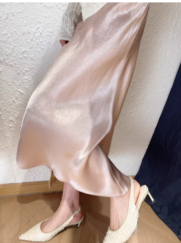 Váy chất liệu acetate 100%, nặng, chất liệu satin bóng, xếp ly, lưng thun cao, dáng chữ A đuôi cá dành cho nữ, mùa xuân hè