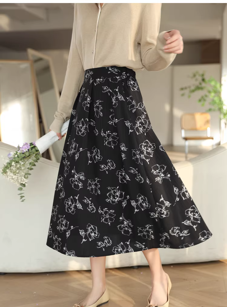 Váy chữ A cạp cao in họa tiết hoa hồng vẽ tay, dài vừa phải, kiểu dáng mới mùa xuân hè dành cho nữ.
