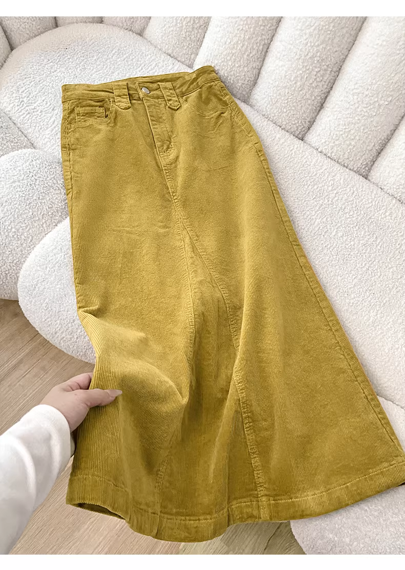- Váy chữ A chất liệu nhung gân màu vàng La Chapelle dành cho nữ, mẫu mới thu đông 2025, lưng cao, dài ngang đùi, kiểu đuôi cá