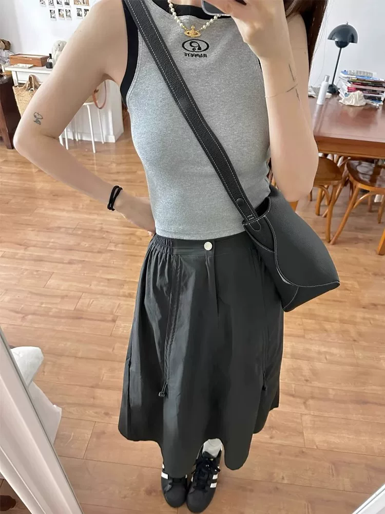 Váy công sở kiểu Mỹ dành cho nữ, cỡ lớn mùa hè, cạp cao, che hông, váy chữ A che hông, dáng dài vừa phải, váy nhanh khô.