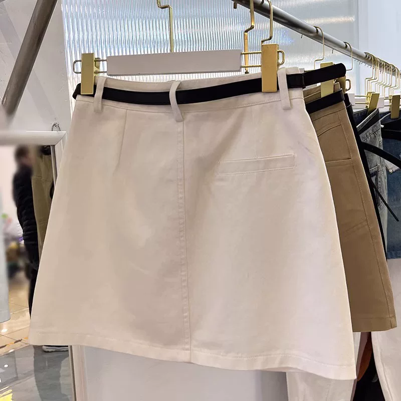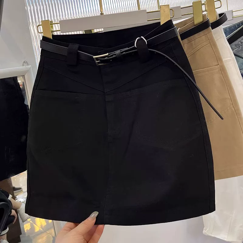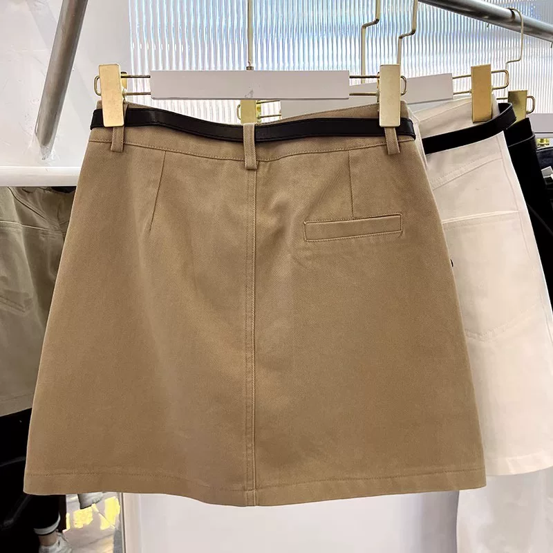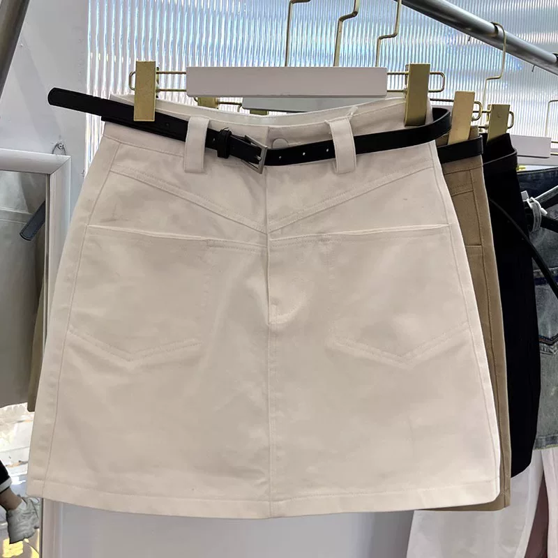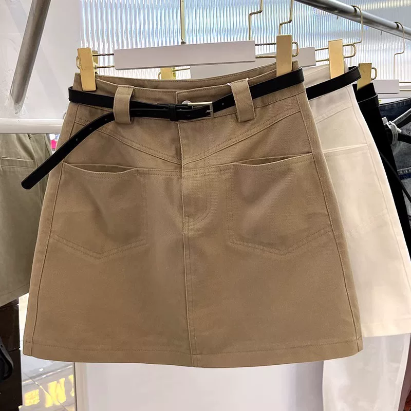 Váy công sở màu kaki dành cho nữ, cỡ lớn mùa hè, váy nửa thân denim, lưng cao, che hông, váy bút chì chữ A thon gọn, váy ngắn.