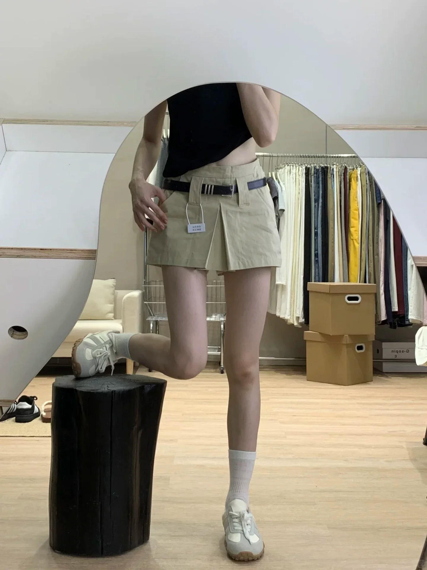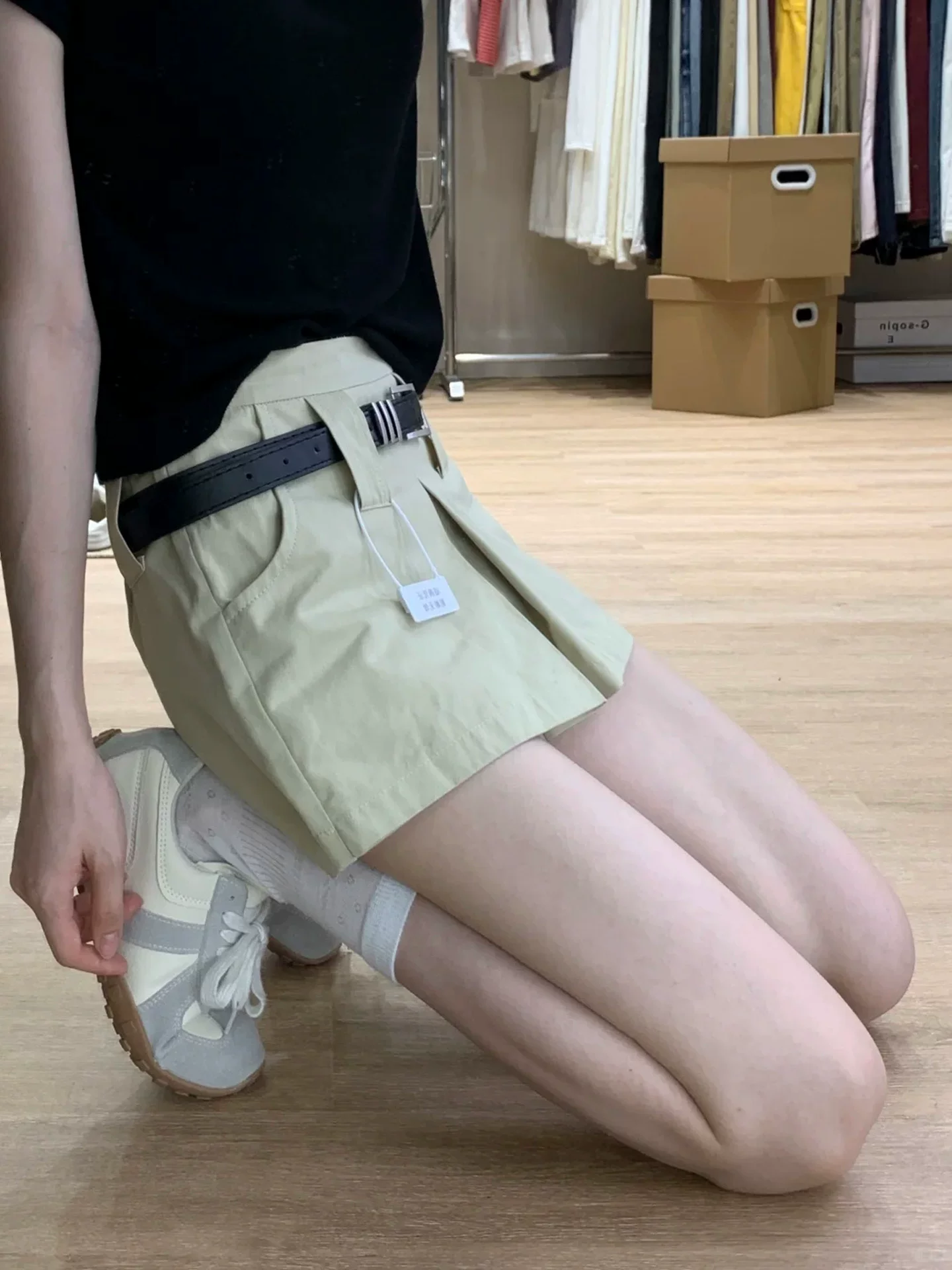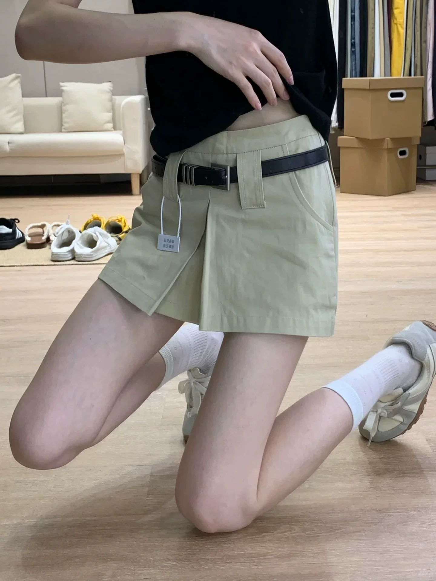 Váy công sở màu kaki dành cho nữ thiết kế mùa hè 2025, kiểu dáng plus size, cạp cao, tôn dáng, kiểu dáng chữ A, quần váy ngắn