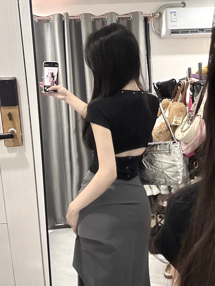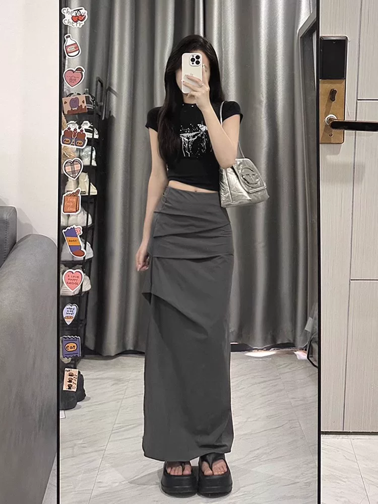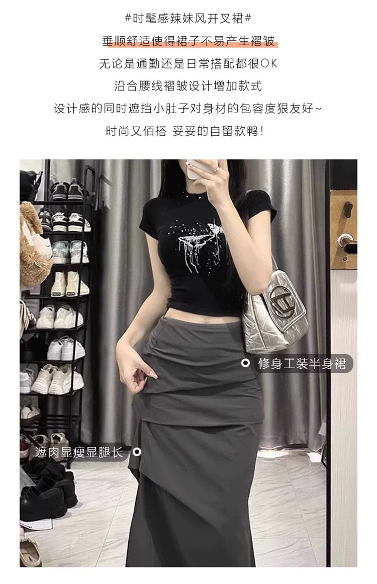 Váy công sở màu xám dành cho nữ, kiểu dáng mỏng mùa hè, cỡ lớn, lưng cao, xẻ tà, che bụng, giảm béo, váy bút chì dài vừa phải.