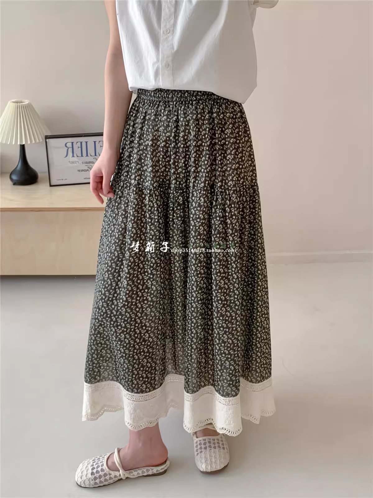 - Váy cotton in họa tiết vintage mùa hè 2025 Dream Box, lưng thun, dáng chữ A, viền ren, dài qua gối