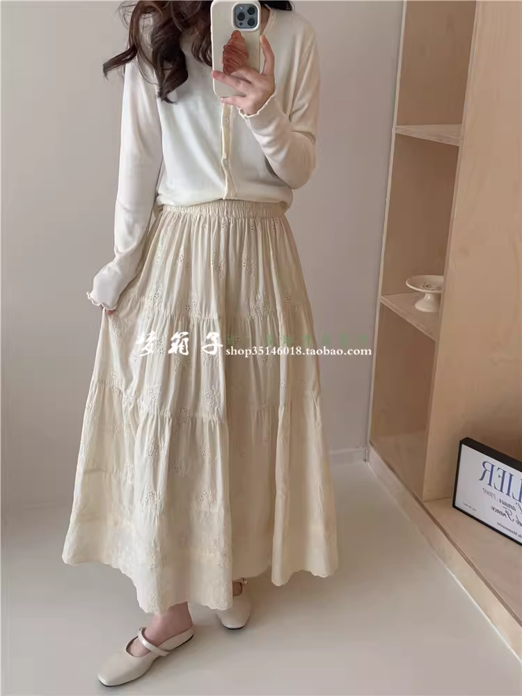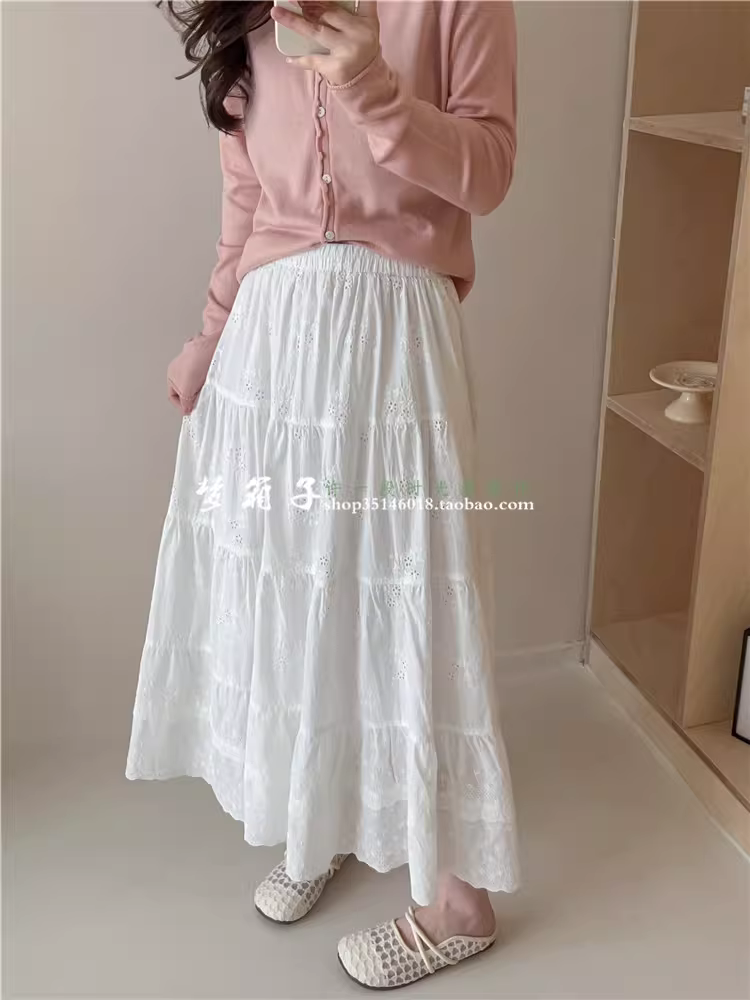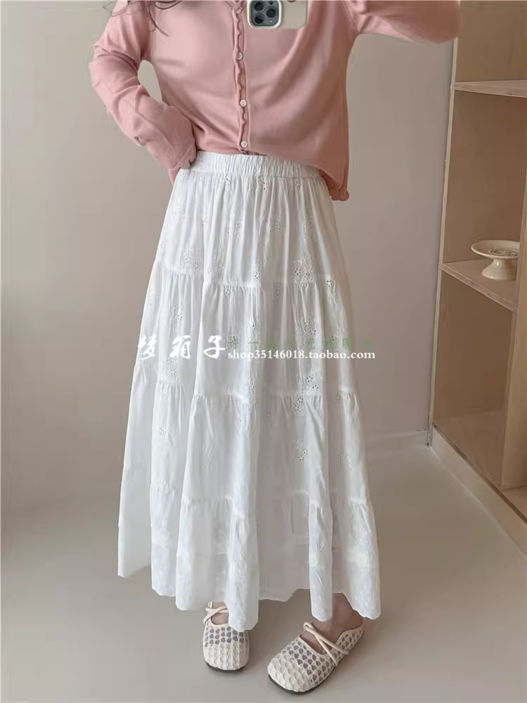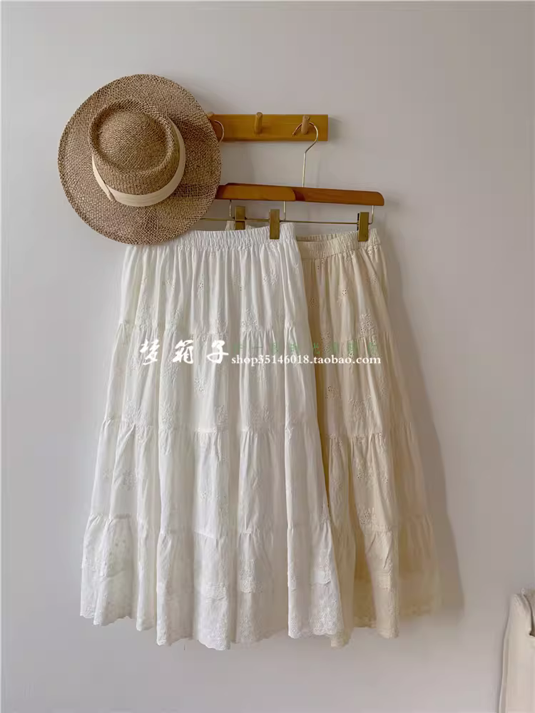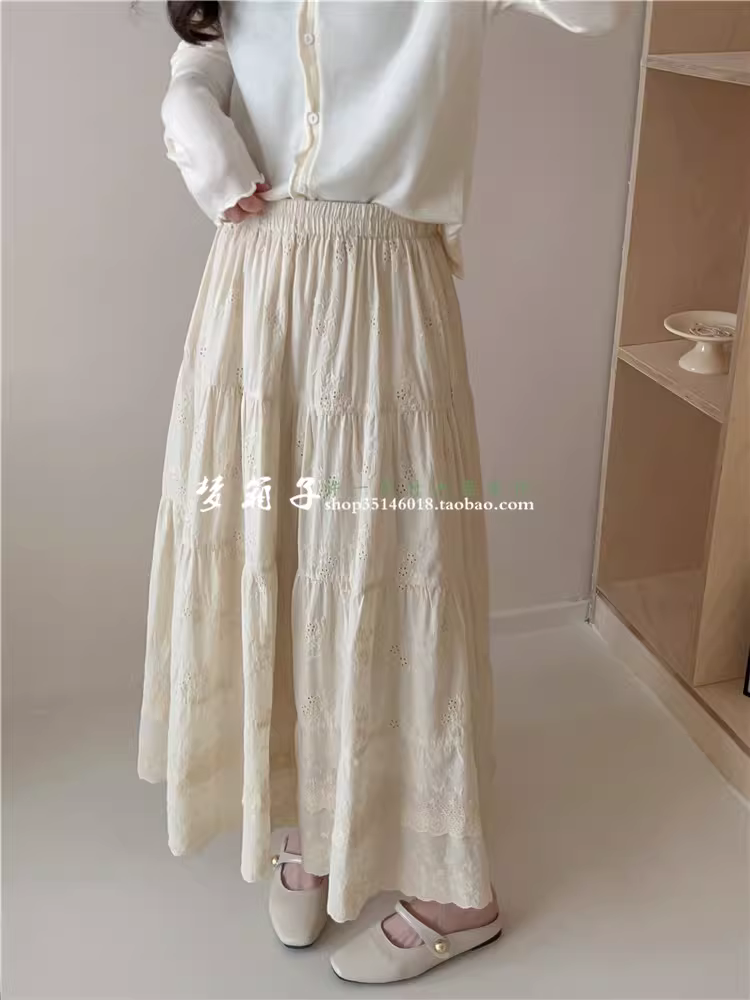 Váy cotton thêu hoa mùa xuân 2025 Dream Box, lưng thun, xếp tầng, phối ren, kiểu bánh ngọt, dài