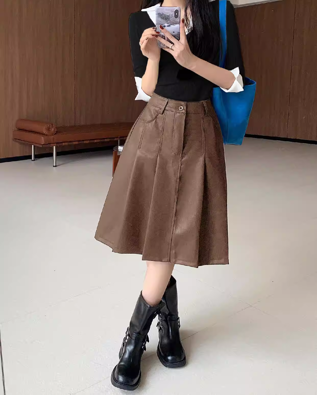 Váy da đen, váy xếp ly da PU thu đông nữ, váy dù dài ngang đùi, váy nửa thân rất đẹp, váy dài ngang đùi.