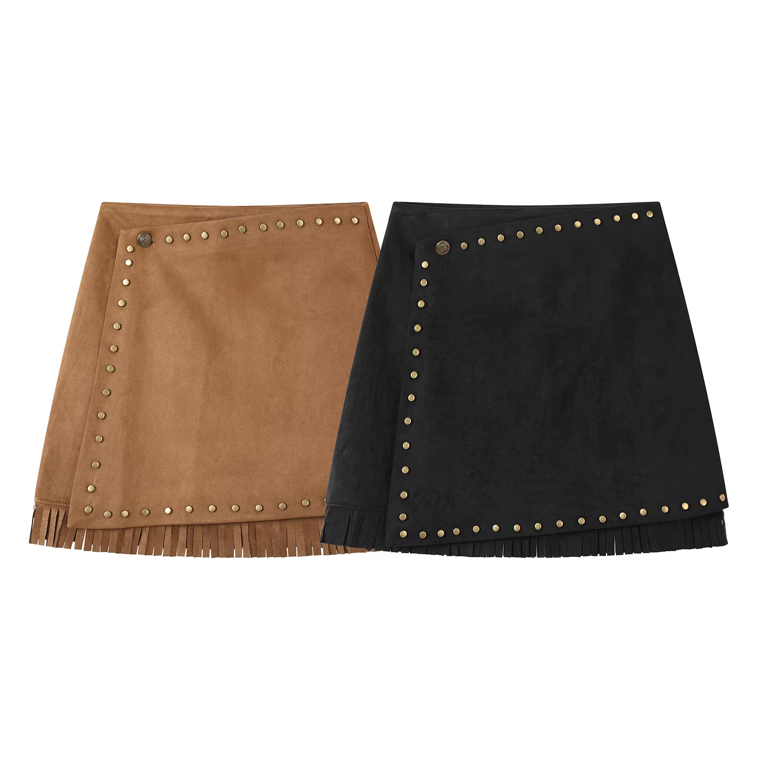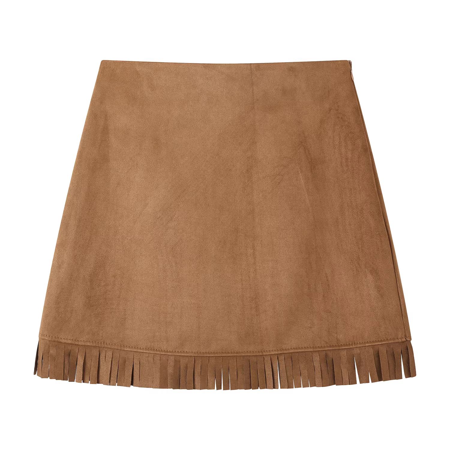- Váy da lộn dáng chữ A ngắn, chất liệu da lộn dày dặn, tua rua, kiểu dáng bất quy tắc, cao eo, tôn dáng, dành cho nữ, mùa thu