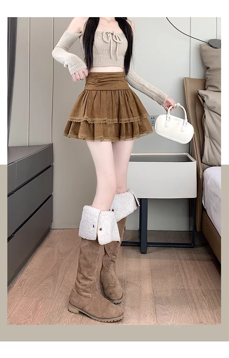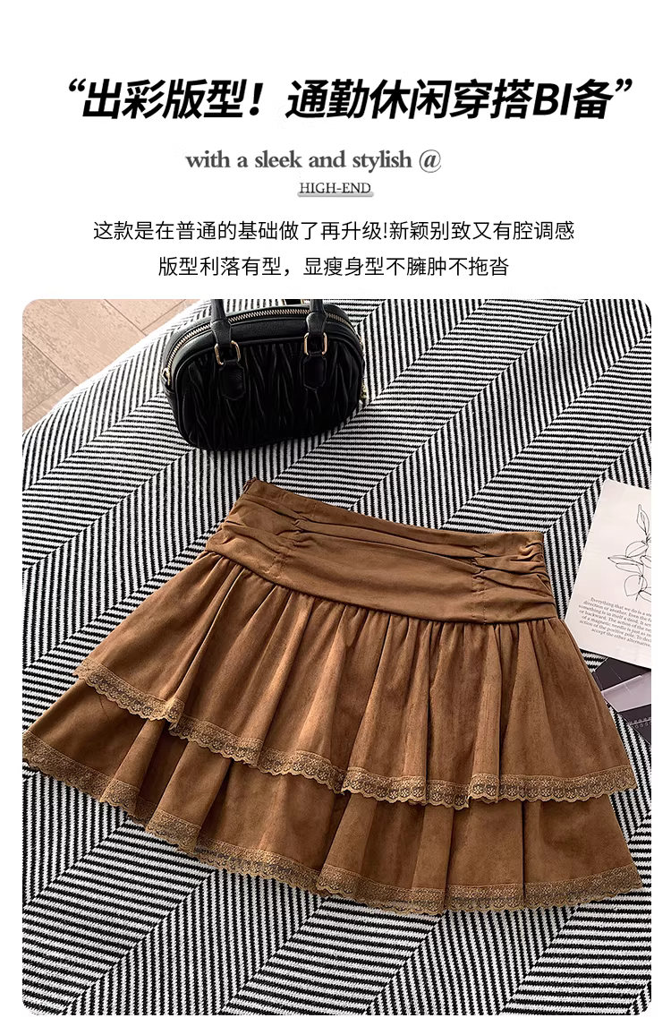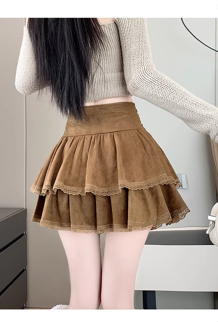 Váy da lộn màu nâu dành cho nữ, váy tutu mùa thu đông, váy nụ hoa, váy bánh nhiều lớp phong cách múa ba lê, váy ngắn bằng da