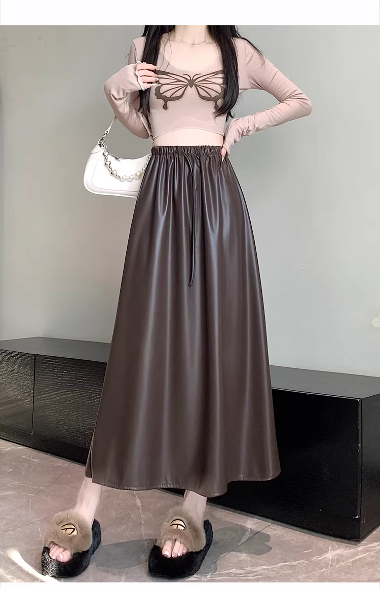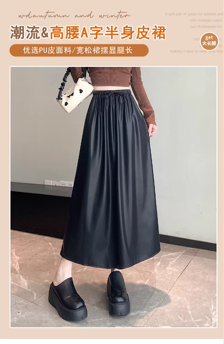 Váy da nâu, váy dù dài trung bình dành cho nữ mùa thu đông, váy da PU, váy nửa thân rất đẹp, váy dài.