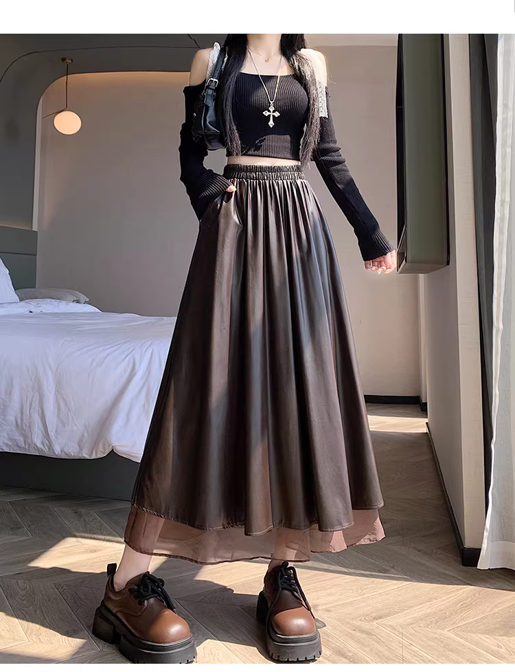 Váy da nâu, váy dù dài vừa phải dành cho nữ mùa thu đông, váy xòe rộng, váy nửa thân rất đẹp, váy dài.