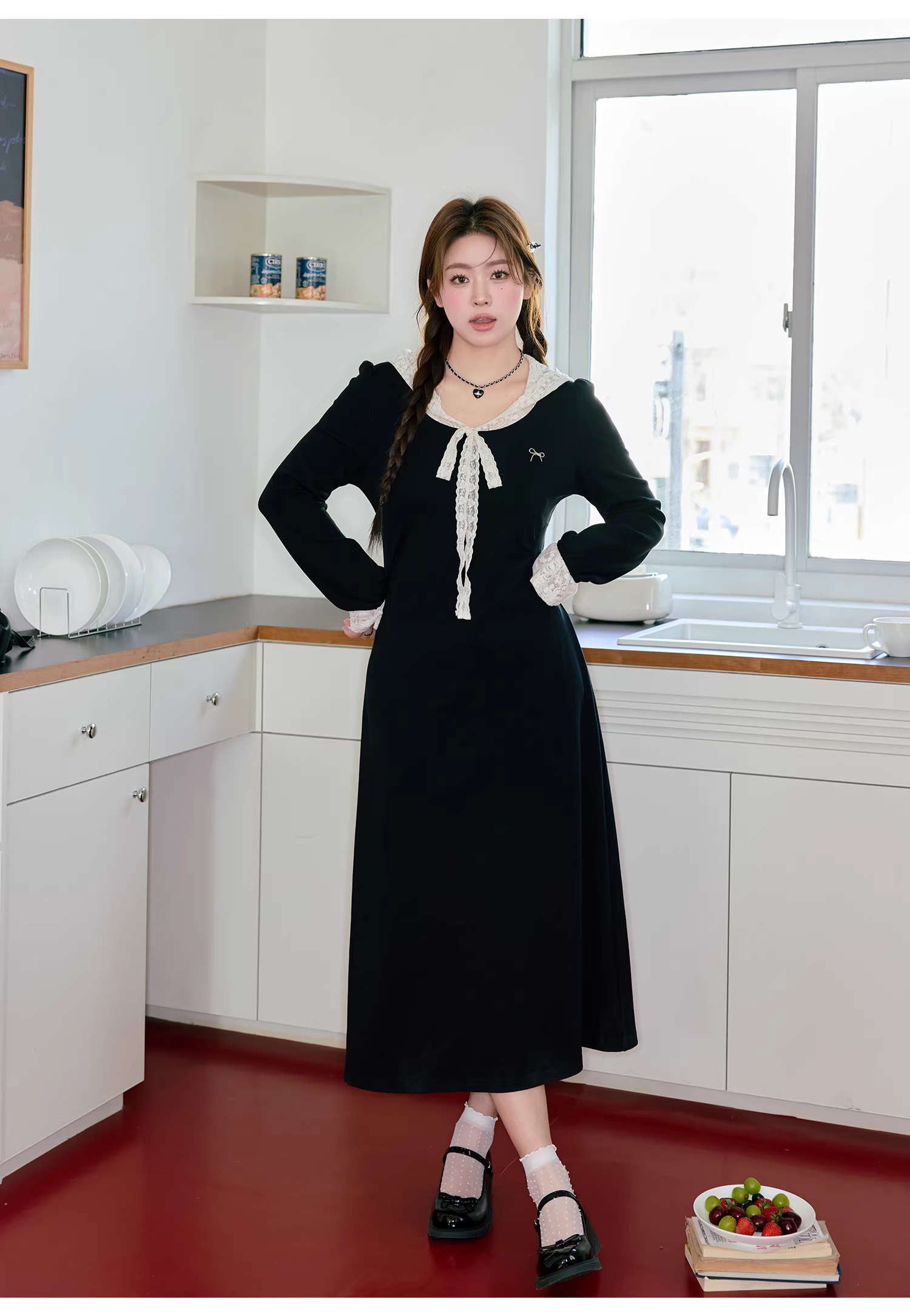 Váy dài kiểu Pháp có mũ trùm đầu, thiết kế phối ren, kiểu dáng ôm eo, giúp thon gọn dáng người, dành cho phụ nữ có kích cỡ lớn.