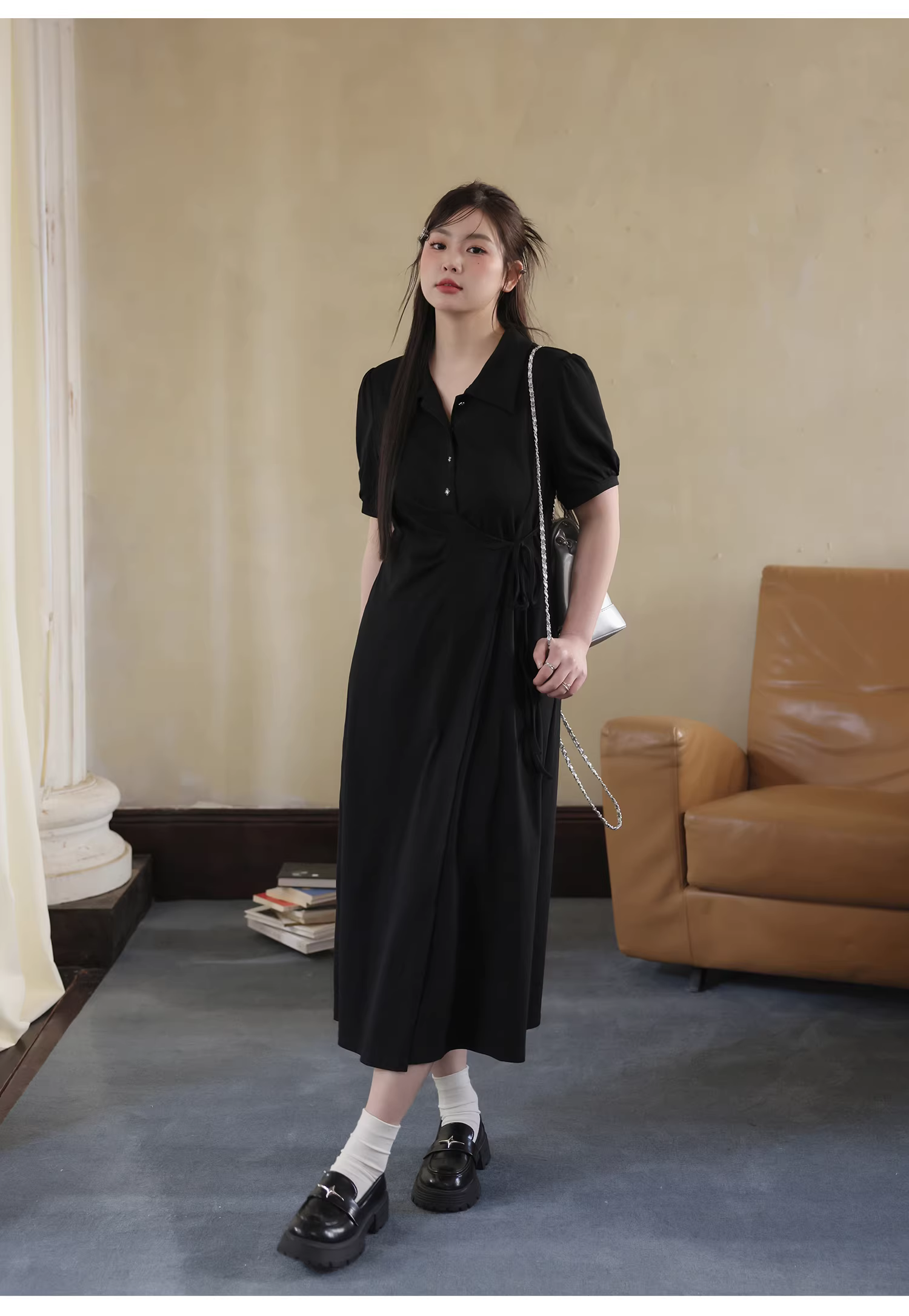 Váy đen kiểu mùa hè của Zhang Daren, váy polo nữ phong cách preppy, váy dài ôm eo kiểu Hàn Quốc.