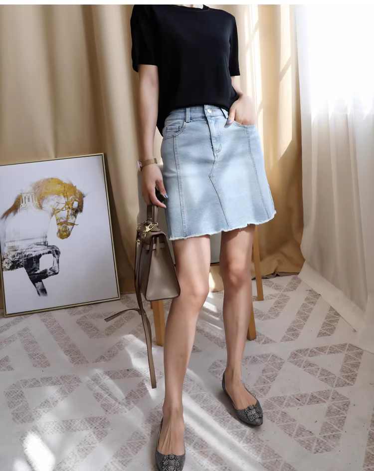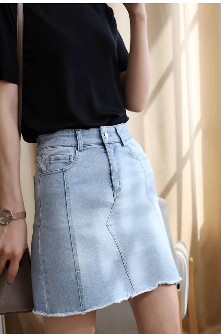 Váy denim cao eo kiểu dáng mới đầu xuân, chất liệu denim Thổ Nhĩ Kỳ, váy ngắn mùa hè nữ, ôm dáng, kiểu dáng chữ A