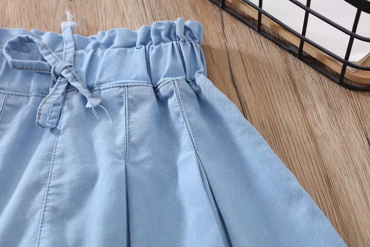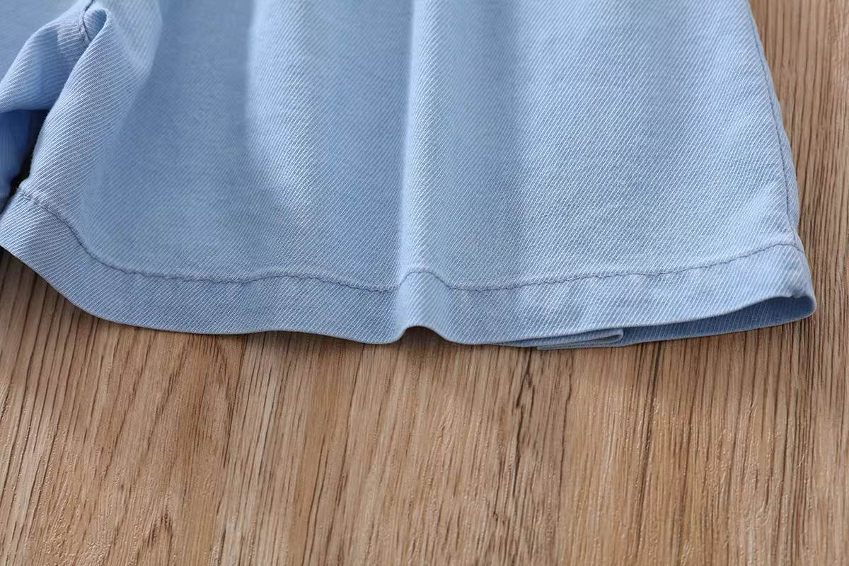 - Váy denim trơn màu cotton hè 2025 phong cách Hàn Quốc và Nhật Bản thời trang trẻ em, quần short denim mỏng, kiểu dáng năng động