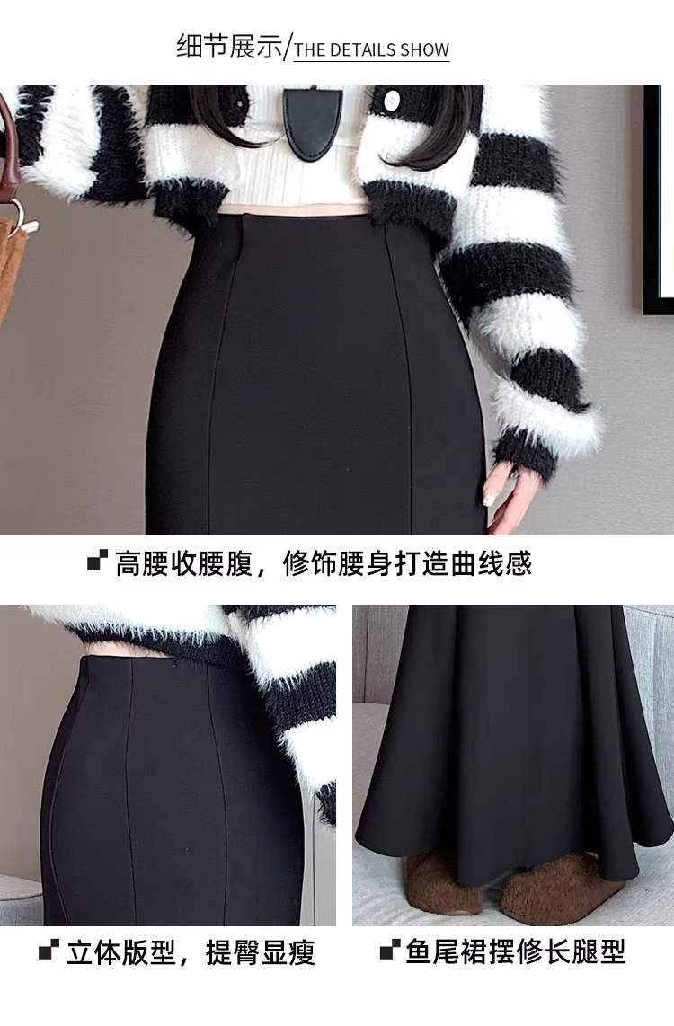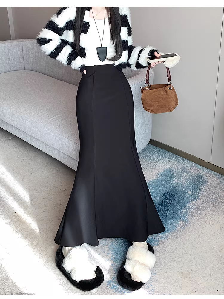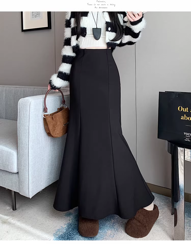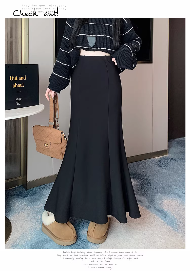 - Váy đuôi cá dày dặn lót lông cừu đen La Chapelle dành cho nữ, mẫu mới thu đông 2025, cạp cao, dáng chữ A, dài qua gối